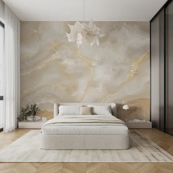 Nappali fotótapéta esetén egyeztesse a mintát a padló és a bútorok tónusával. A geometrikus és a lágy virágos témák jól kombinálhatók. A cél a fókuszfal kijelölése, nem a túlzsúfolás.