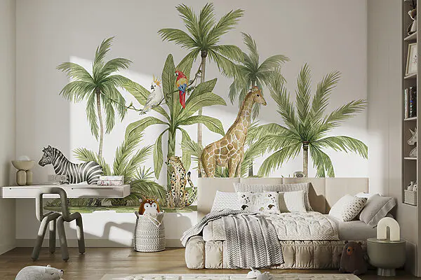 Fotótapéta Zsiráfok egy erdőben fákkal és növényekkel