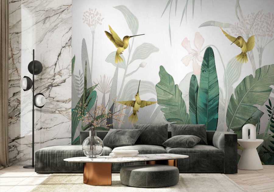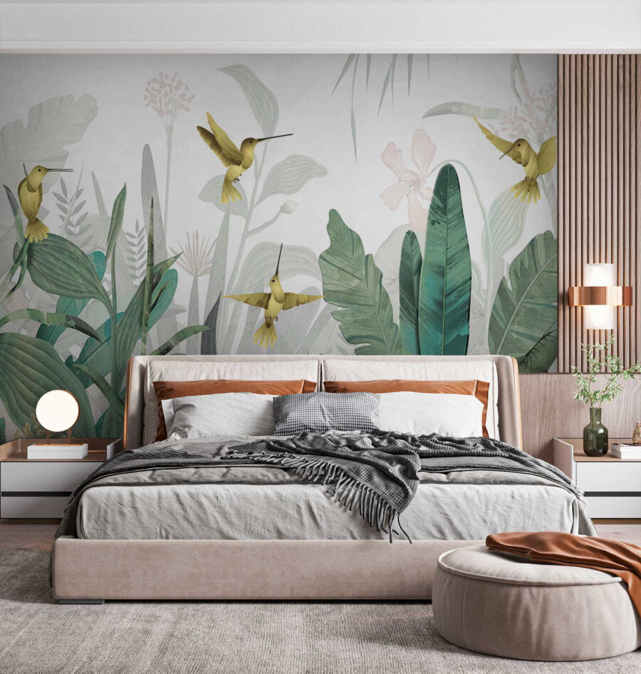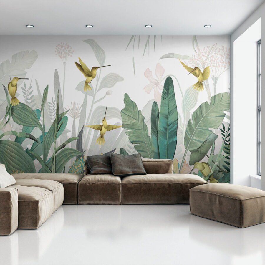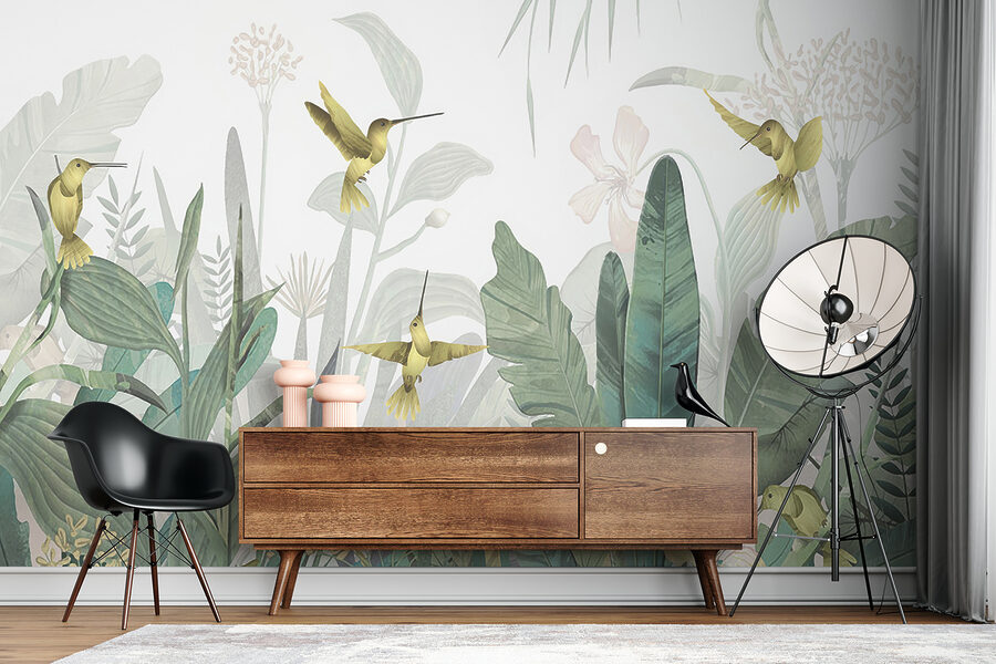 Képzelje el, hogy belép egy szobába, és úgy érzi, mintha egy buja dzsungelparadicsomba lépett volna – kolibrik röpködnek körülötte, vibráló lombok veszik körül. Ez a “Kolibrik röpködnek a buja lombok között” című falfestmény pontosan ezt teszi egy térrel. Olyan, mintha a trópusi mennyország egy kis darabkája lenne a falon!