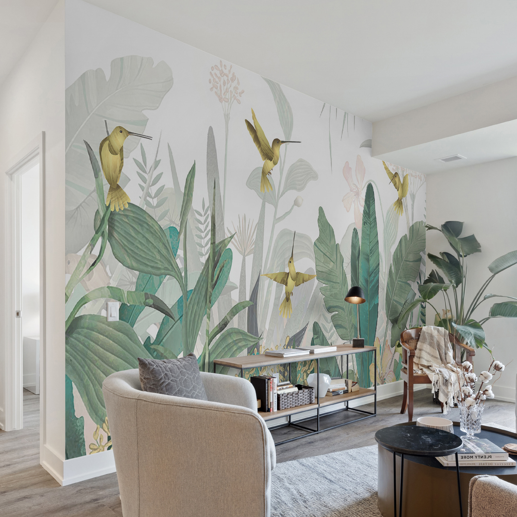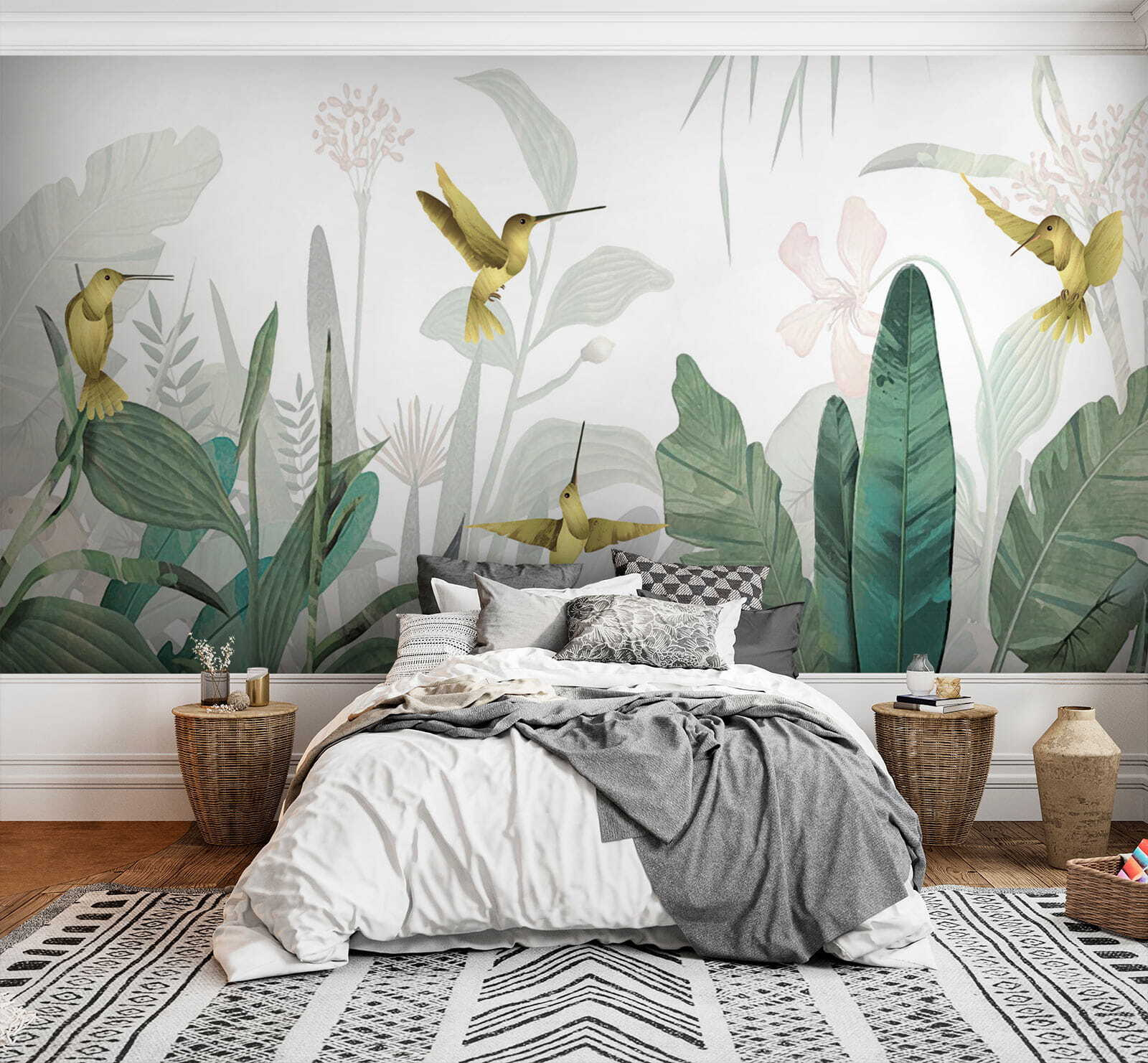Képzelje el, hogy belép egy szobába, és úgy érzi, mintha egy buja dzsungelparadicsomba lépett volna – kolibrik röpködnek körülötte, vibráló lombok veszik körül. Ez a “Kolibrik röpködnek a buja lombok között” című falfestmény pontosan ezt teszi egy térrel. Olyan, mintha a trópusi mennyország egy kis darabkája lenne a falon!