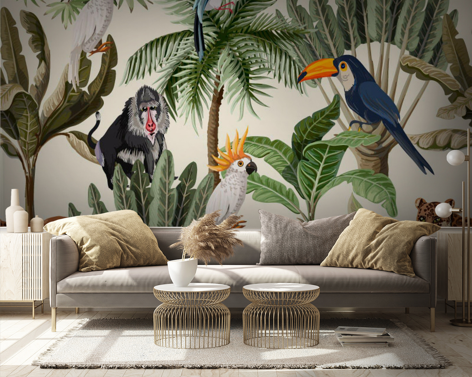Változtasson bármelyik szobát trópusi paradicsommá ezzel a vibráló falfestménnyel, amely bájos növényeket és egzotikus madarakat ábrázol, tökéletes azok számára, akik színfoltokra vágynak! Képzelje el, ahogy belép a helyiségébe, és úgy érzi, mintha egy buja dzsungelbe repítette volna. A papagájok, leopárdok és más élénk állatfajok játékos kombinációi kalandvágyat keltenek. Olyan, mintha a természet egy kis darabkáját hozná be a lakásba – bogarak nélkül! Ez a falfestmény remekül illik gyerekszobába, nappaliba vagy bárhová, ahová jól jönne egy kis vidámság, és kellemes beszélgetésindító. Ellenállhatatlan!