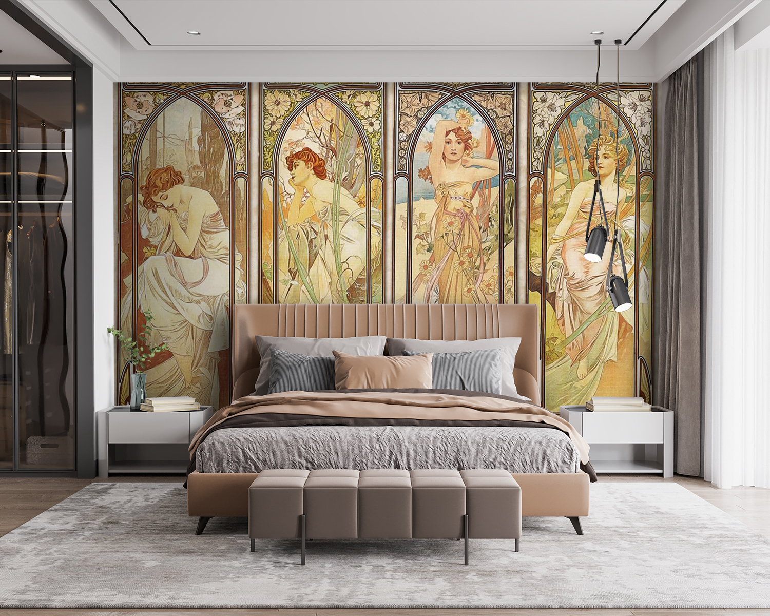 Varázsolja át otthonát ezzel a bájos, szecessziós stílusú faliképpel, amelyen egy elbűvölő női csoport látható. Képzelje el, hogy felébred, és úgy érzi, mintha egy szeszélyes álomba csöppent volna, ahol áramló vonalak és élénk színek táncolnak a falakon. Minden nő egy-egy történetet mesél, elmerülve gondolataiban vagy a természetet ünnepelve. Mintha meghívnák Önt a világukba, amint belép az ajtón. Ez a tapéta tökéletes egy hangulatos olvasósarokhoz vagy művészi dísztárgyként, magával ragadja Önt, és úgy érzi, mintha a művészet élne. Ráadásul ki ne élvezné a napi adag szépséget? Talán tegyen hozzá egy kényelmes széket, egy jó könyvet, és csak élvezze ezt a varázslatos hangulatot. Higgye el, bármelyik szobát kis menedékké varázsol.