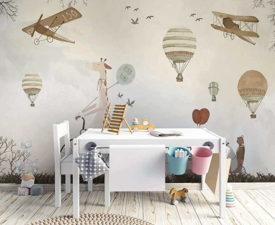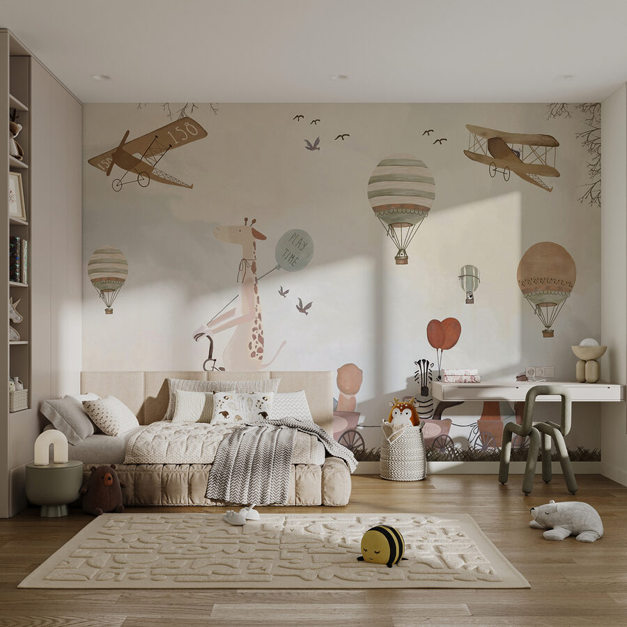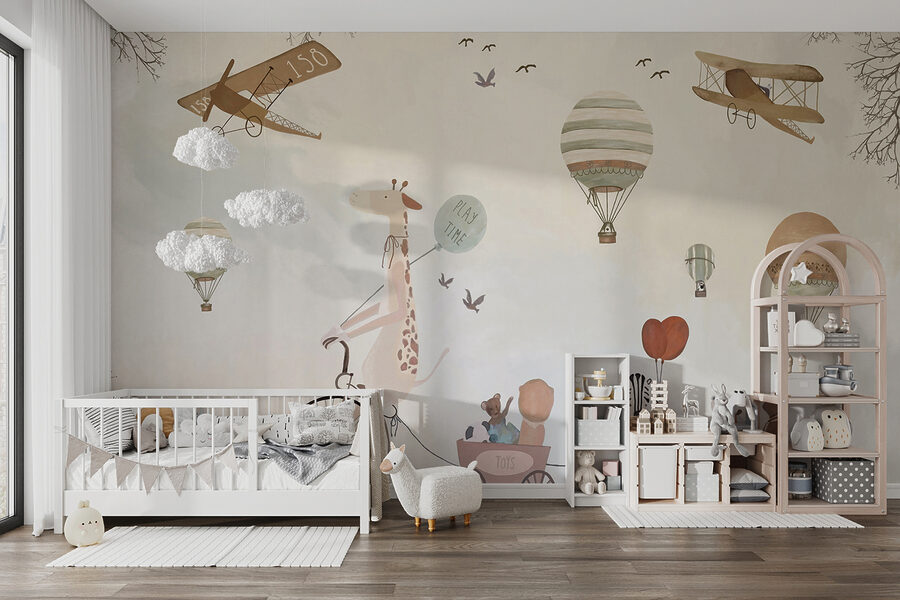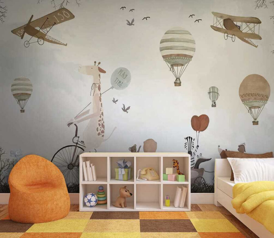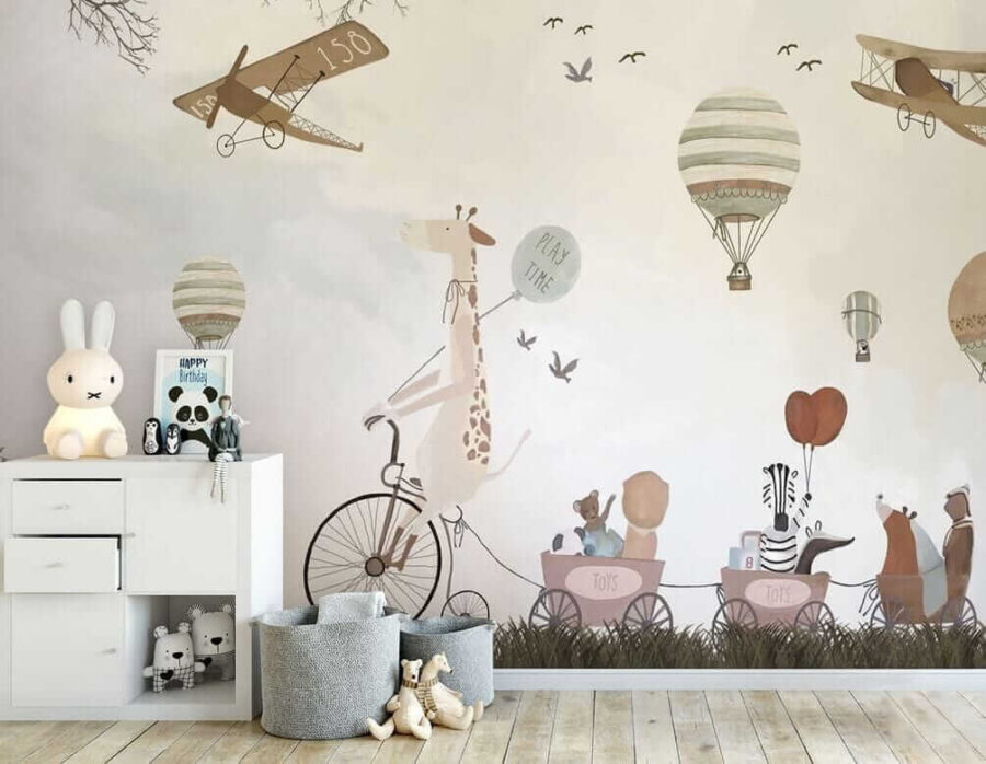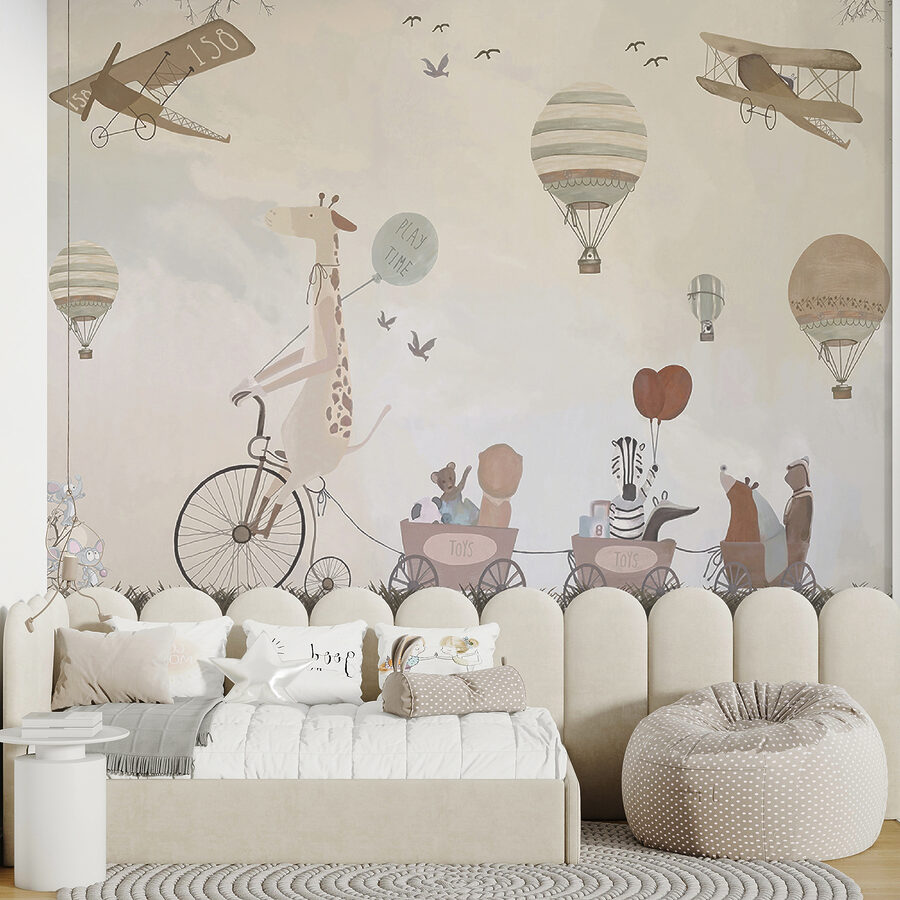 Alakítsd át a gyerekszobát egy szeszélyes kalanddá ezzel a bájos hőlégballonos falfestménnyel! Képzelj el egy kacagó zsiráfot a biciklin, amint imádnivaló állatbarátokkal osztja meg a “játékidő” hangulatát – olyan, mintha egy mesekönyv elevenedne meg.