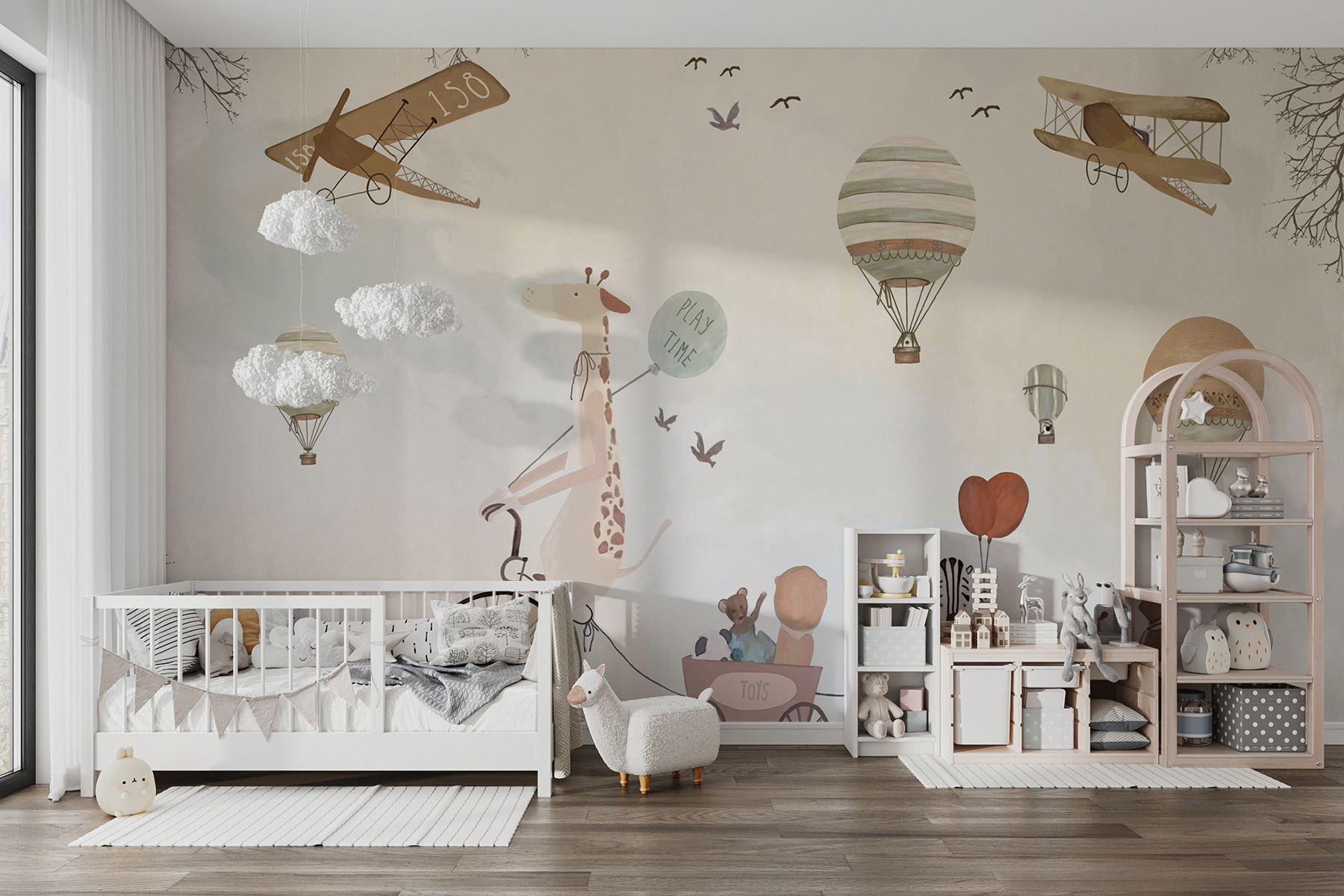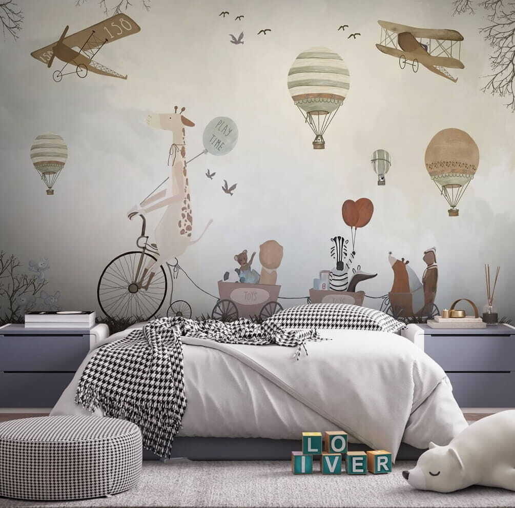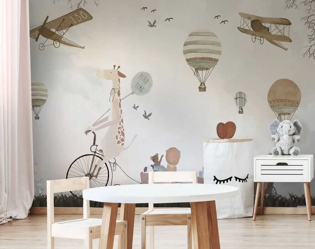 Alakítsd át a gyerekszobát egy szeszélyes kalanddá ezzel a bájos hőlégballonos falfestménnyel! Képzelj el egy kacagó zsiráfot a biciklin, amint imádnivaló állatbarátokkal osztja meg a “játékidő” hangulatát – olyan, mintha egy mesekönyv elevenedne meg.