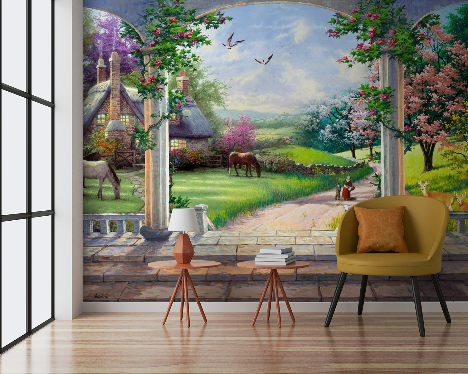 Varázsoljon bármelyik szobát nyugodt menedékké ezzel a elbűvölő faliképpel! Képzelje el egy álomszerű tájat, ahol lovak lustán legelnek, és egy bájos kis házikó bújik elő a virágok közül. Mintha egy mesekönyvbe lépne be – nincs szükség varázslatos átjáróra! Képzelje el, ahogy reggeli kávéját kortyolgatja, miközben a madarak énekelnek, és a szarvasok vendégszerepelnek odakint. Ez a tapéta egy kis természetet csempész az otthonába, így a mindennapok egy kicsit szeszélyesebbé válnak. Tökéletes egy hangulatos légkör megteremtéséhez vagy a barátaival való beszélgetések megindításához. Kinek kell nyaralás, ha egy műalkotásban élhet?