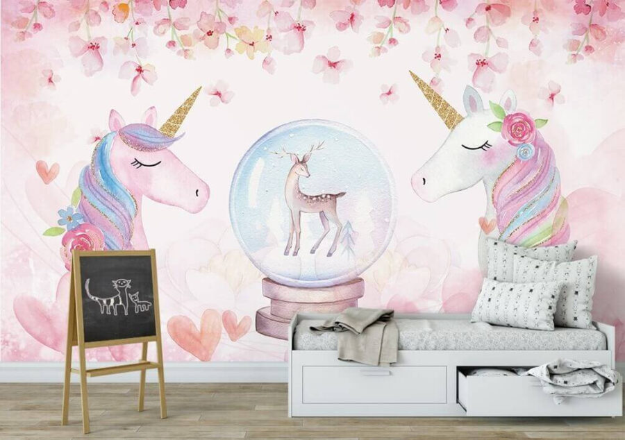 A lágy rózsaszín virágárnyalatok között szelíd egyszarvúakkal és egy lenyűgöző szarvassal a hógömbben ez a falfestmény olyan, mintha egyenesen egy meséből lépett volna elő. A lágy akvarell árnyalatok megnyugtatóak, míg a játékos részletek fantáziát és szeszélyt ébresztenek.