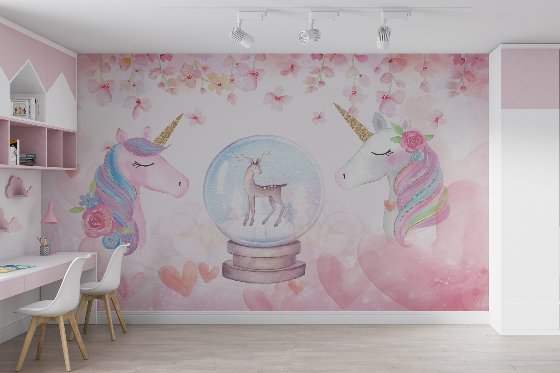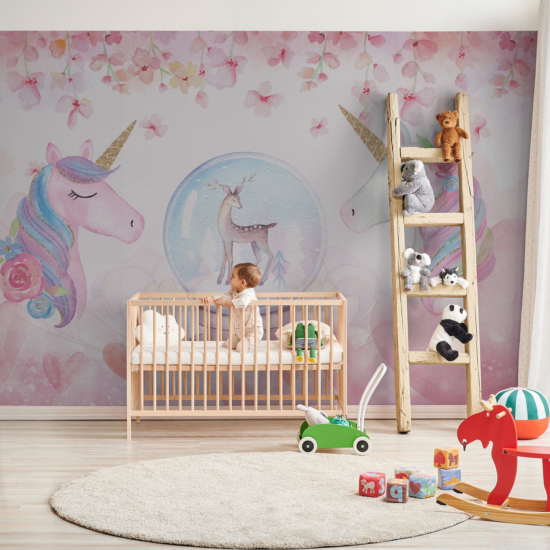 A lágy rózsaszín virágárnyalatok között szelíd egyszarvúakkal és egy lenyűgöző szarvassal a hógömbben ez a falfestmény olyan, mintha egyenesen egy meséből lépett volna elő. A lágy akvarell árnyalatok megnyugtatóak, míg a játékos részletek fantáziát és szeszélyt ébresztenek.