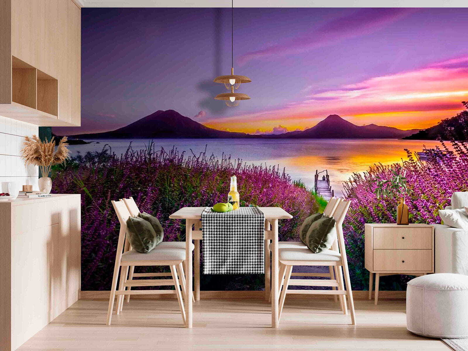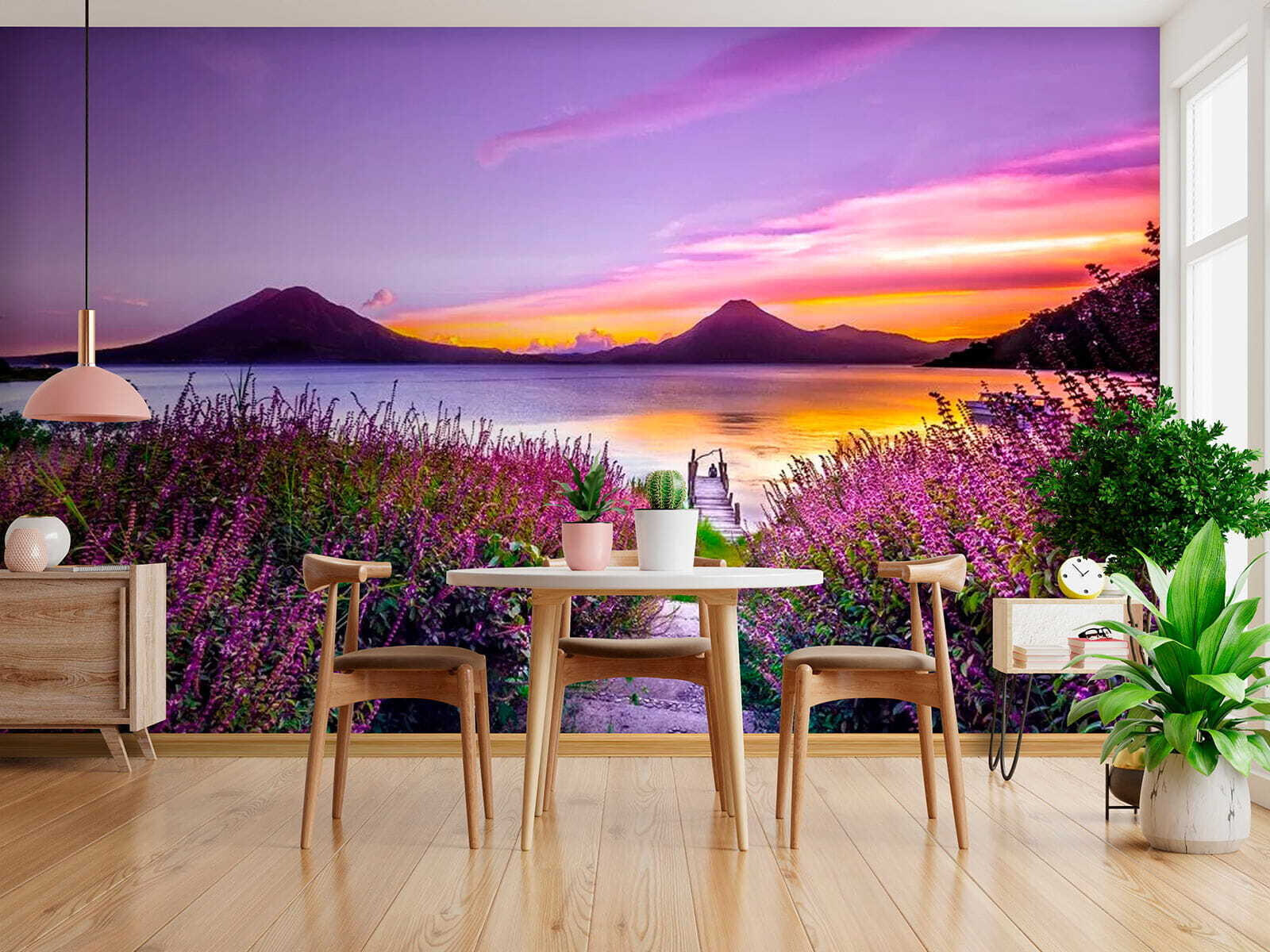 Képzelje el, hogy minden alkalommal, amikor a falára pillant, egy nyugodt menekülésbe lép. Ez a falfestmény, amely egy nyugodt ösvényt ábrázol, amely egy csillogó tóhoz vezet, amelyet élénk lila virágok kereteznek, egyenesen a természet ölelésébe vonzza Önt. A nyugtató lilák és kékek nyugodt hangulatot teremtenek, amely tökéletes egy hangulatos olvasósarokba vagy egy barátságos bejáratba. Ahogy a nap a horizont alá süllyed, ezek a szelíd árnyalatok a béke érzését idézik. Olyan, mintha egy mini vakációt tartanál otthon, ahol minden pillantás egy kicsit csendesebbnek és világosabbnak érezheted a kinti világot. Tökéletes az álmodozáshoz vagy egyszerűen csak a kikapcsolódáshoz.