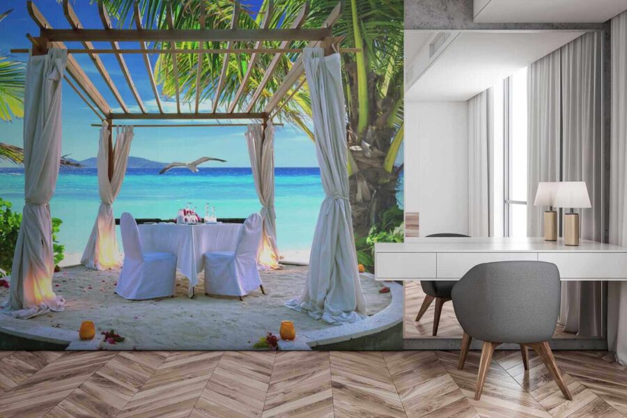 Képzelje el, hogy otthonról kilépve egy paradicsomi környezetbe csöppen. Ez a vibráló falikép, a „Wall Murals Table Set Up on a Beach” (Faliképek: Asztal a tengerparton) arra invitálja, hogy dőljön hátra a nappalijában, és álmodozzon a homokos tengerpartról és a tengeri szellőről. Képzelje el egy romantikus vacsorát a hullámzó pálmafák alatt, a háttérben a hullámok szelíd morajával. Minden alkalommal, amikor ránéz, olyan, mintha egy mini vakációt élne át! Élénk színeivel és trópusi hangulatával ez a tapéta életet lehel minden térbe. Tökéletes álmodozóknak és tengerparti szerelmeseinek, mert megtalálja az egyensúlyt a kikapcsolódás és a kaland között. Hozzon egy kis tengerparti varázslatot az otthonába – ki ne szeretné ezt?