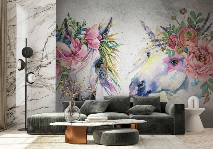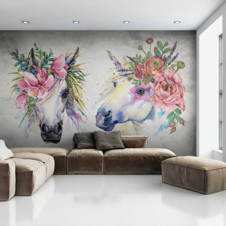 Képzeld el, ahogy besétálsz egy szobába, és ezek a lenyűgöző, virágkoronákkal díszített lovak fogadnak! Ez a vibráló falfestmény színpompát és szeszélyt visz bármilyen térbe – tökéletes gyermekszobába, gyerekszobába vagy akár kreatív műterembe. Az akvarell hangulat egyszerűen álomszép, szinte olyan, mintha egy mesekertbe léptél volna. A finom virágok és a lovak kifejező szemei olyan varázslatos és nyugodt hangulatot kölcsönöznek, amelynek nehéz ellenállni.