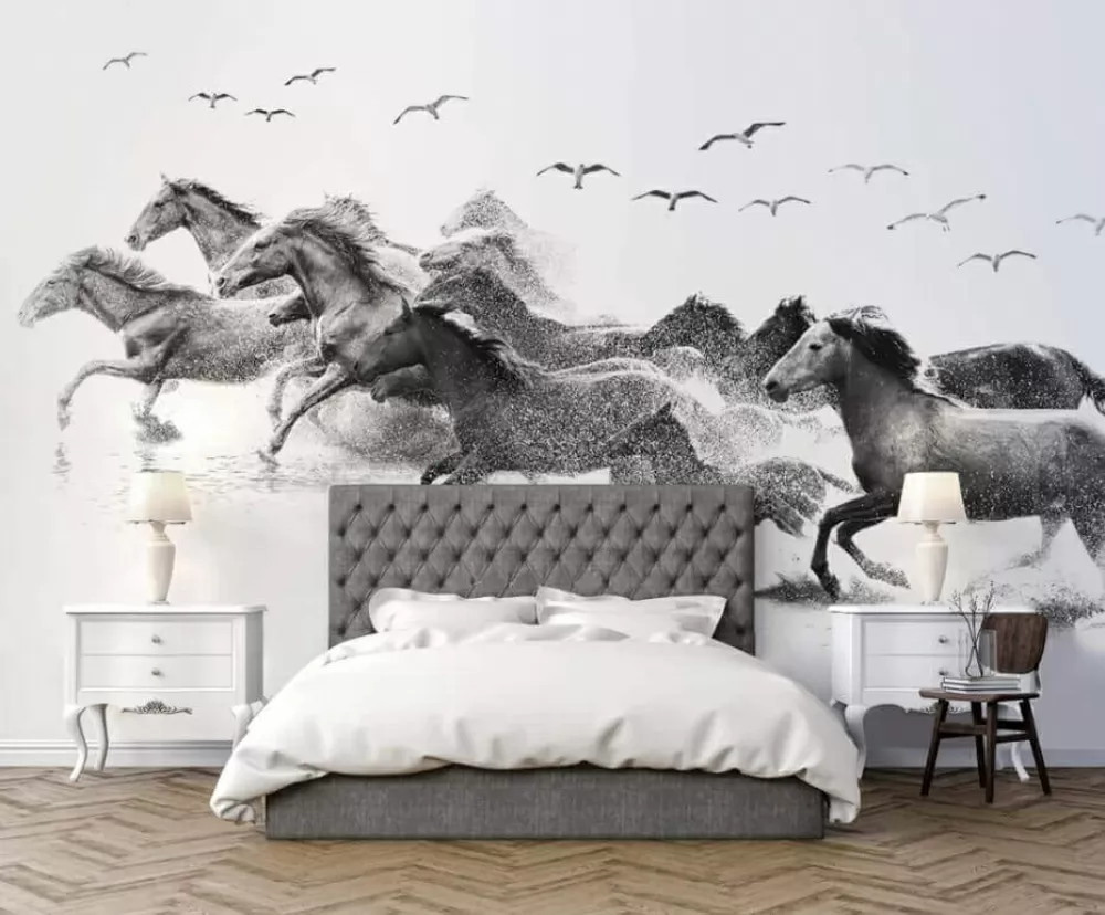 Nézze meg ezt a lenyűgöző falfestményt – képzeljen el egy csapat fenséges lovat, amint a vízben csobognak, lélegzetelállító fekete-fehérben megörökítve. Olyan, mintha a természet nyers energiájának egy darabja közvetlenül a faladon lenne. Tökéletes bármely olyan helyiségbe, amelynek szüksége van egy kis dinamizmusra; ezek a galoppozó szépségek tele vannak élettel és mozgással, és bármely helyiséget élénkebbé és élettel telibbé tesznek.