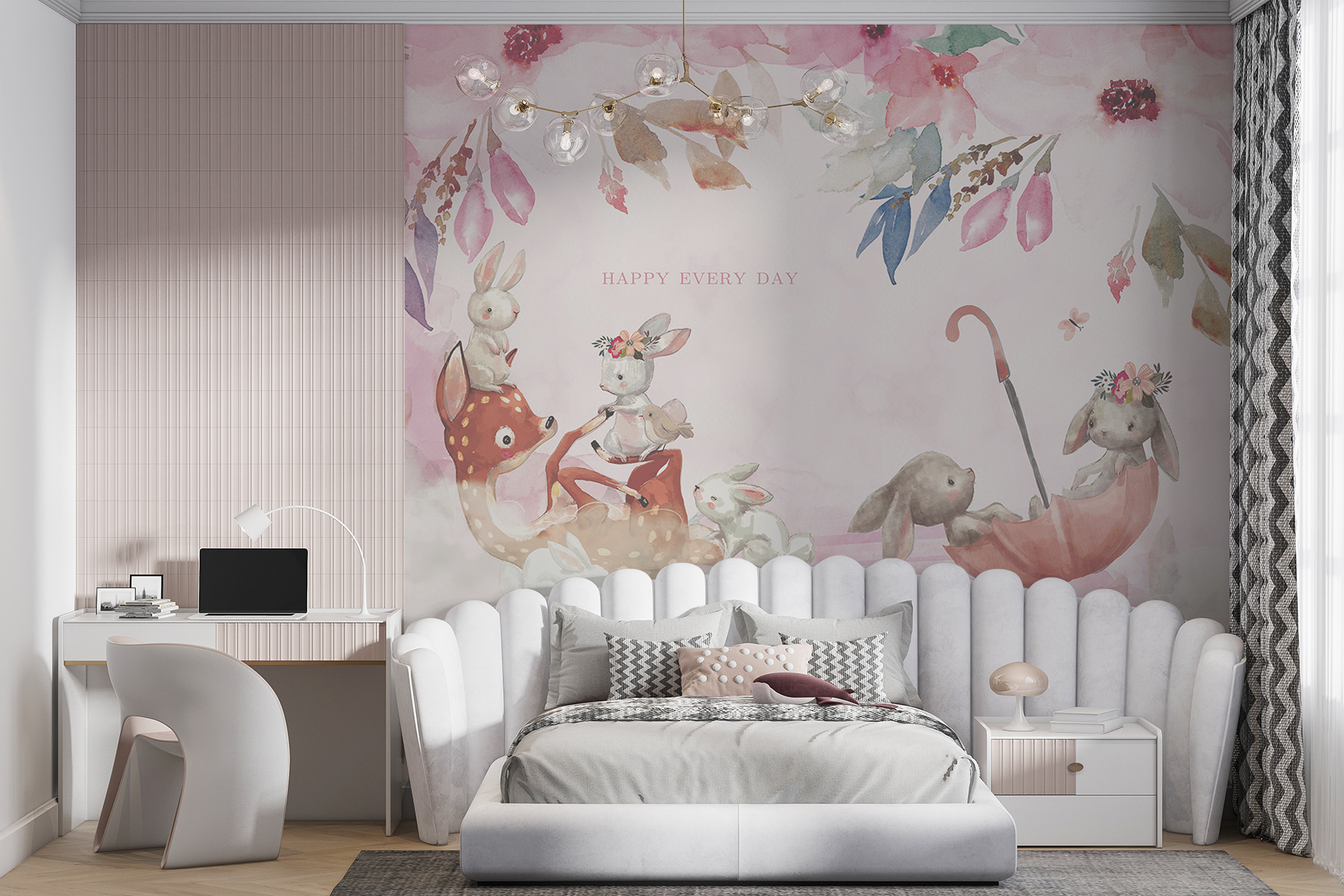 Szeretné teljesen varázslatossá tenni a gyerekszobát? Nézd meg ezt az imádnivaló “Nyúl virágokkal” falfestményt! Tökéletes a lánya szobájába, a legaranyosabb nyuszit ábrázolja virágokkal a fején – mint egy apró erdei hercegnő. Képzeld el: a gyengéd pasztellszínek álmodozó és megnyugtató hangulatot teremtenek, és minden esti mesét egy kicsit szeszélyesebbé tesznek. Képzeld el, hogy a kisgyermeked szeme felcsillan, valahányszor meglátja… Tiszta varázslat! Ez nem csak egy falfestmény; ez egy meghívás a képzelet és a kacagás világába. És hé, ki ne szeretné, ha egy nyuszi barátja vigyázna rá, miközben játszik és álmodozik? Ez az édes, finom dizájn biztosan melegséget és örömet hoz bármilyen térbe. Ráadásul remek hátteret biztosít a családi fotókhoz, amelyeket örökre megőrizhetsz. Hát nem látod? Annyira elbűvölő… annyira tökéletes!