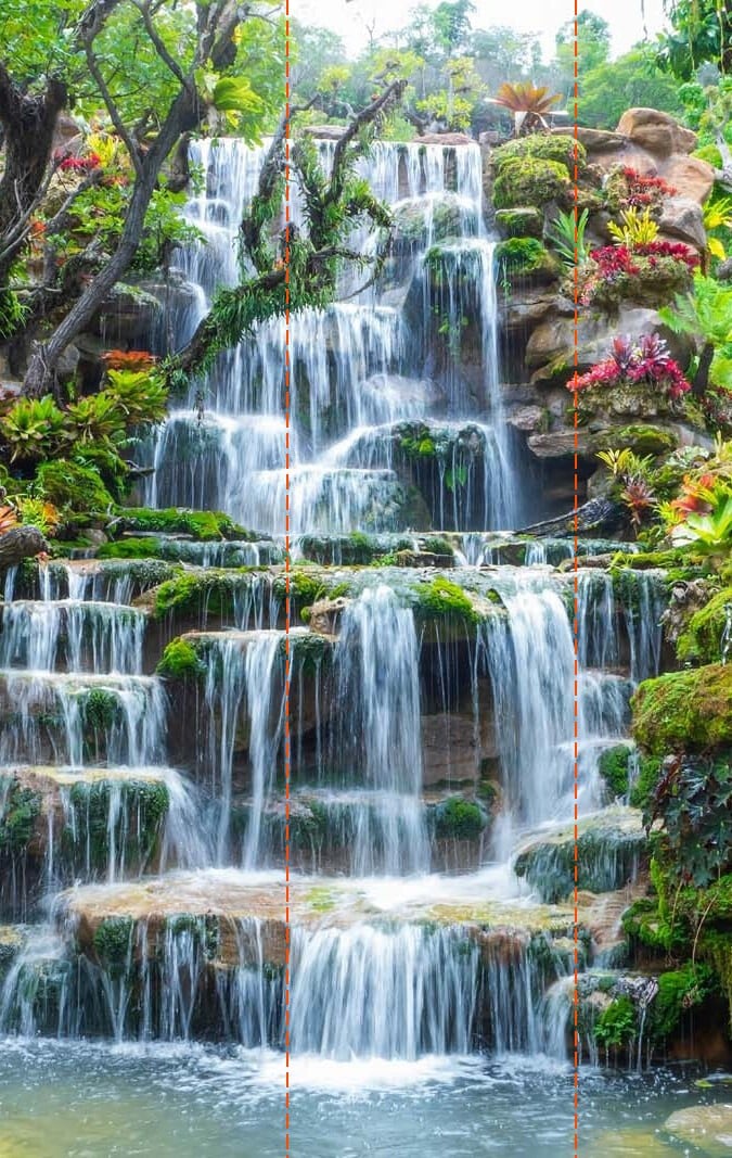Ez a falfestmény tökéletesen alkalmas arra, hogy bármelyik helyiséget nyugodt hangulatúvá tegye, mivel egy vízesés buja zöldjét és nyugtató vizét örökíti meg. Szinte hallani lehet a víz lágy áramlását, és érezni a hűs, frissítő pára áramlását.