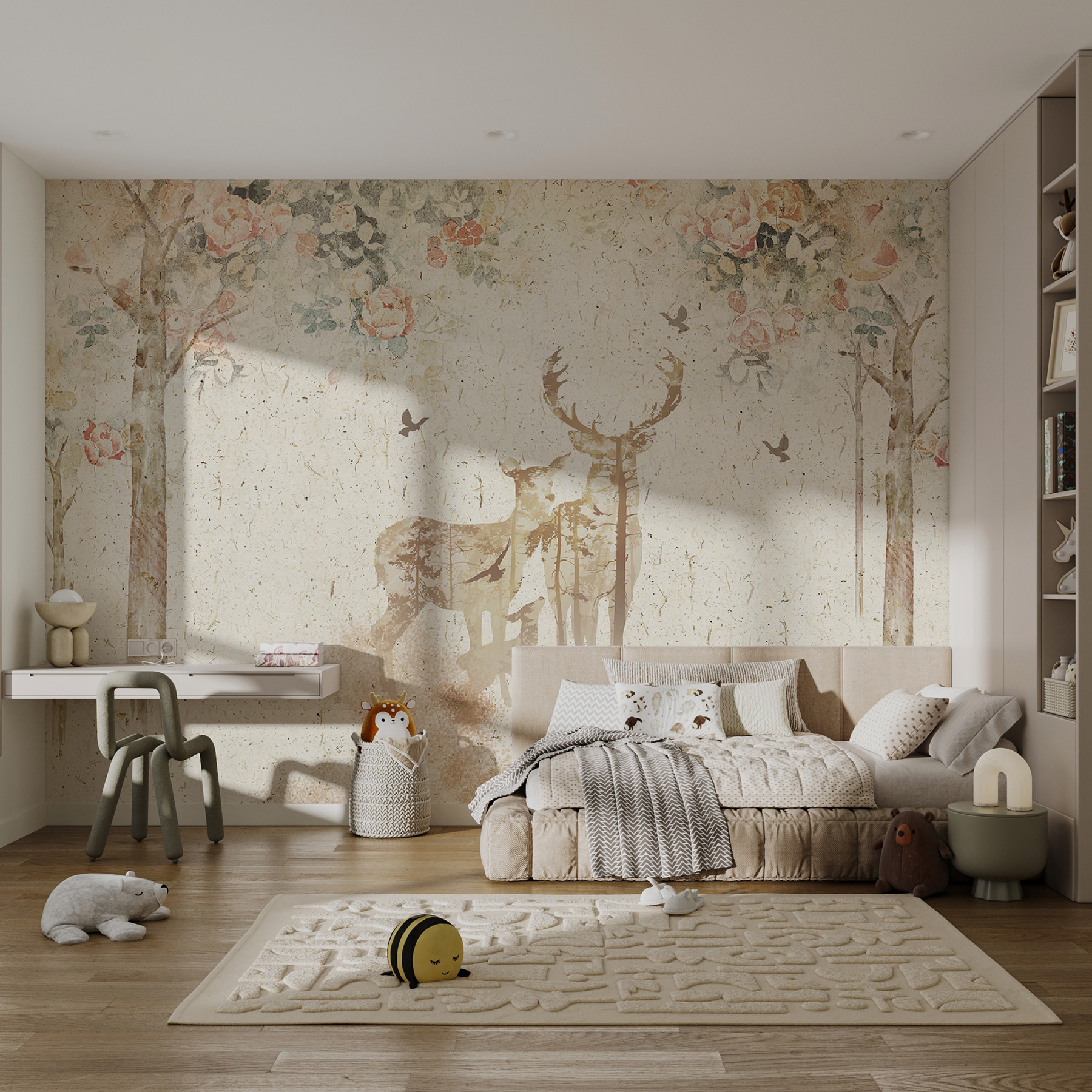 Képzelje el, hogy egy szelíd erdei jelenet van a falán! A “Madár a csempén” falfestmény egyenesen egy álomszép erdőbe repít, ahol szarvasok és madarak békésen élnek egymás mellett. Olyan, mintha egy tündérmesébe lépnél minden alkalommal, amikor belépsz a szobába – tökéletes egy gyermek szentélyébe, vagy egy bájos kiegészítője bármely olyan helyiségnek, amelynek egy kis szeszélyre van szüksége. A lágy, pasztellszínű virágok és a játékos madarak egy csipetnyi varázslatot adnak hozzá. Ez nem csak egy tapéta; ez egy kibontakozásra váró történet, amely a természet nyugalmát hozza el otthonába. Varázslatos, igaz? 🌸🦌🌿