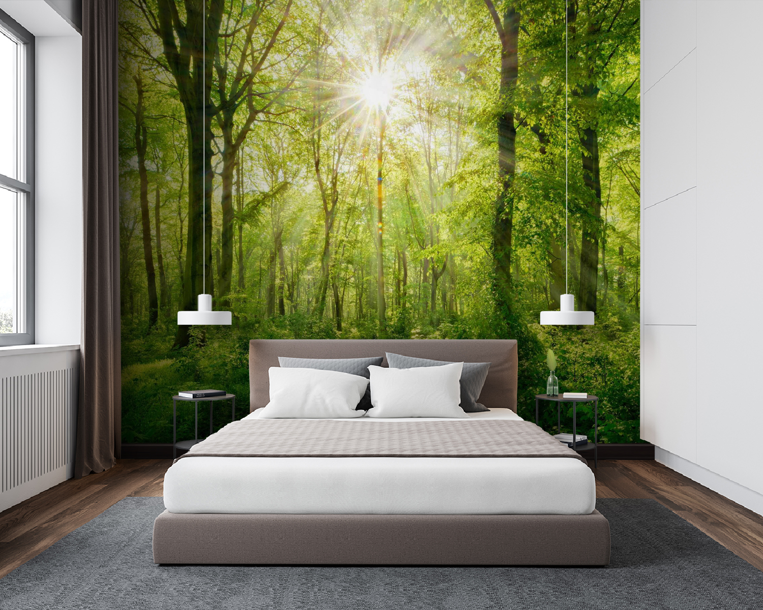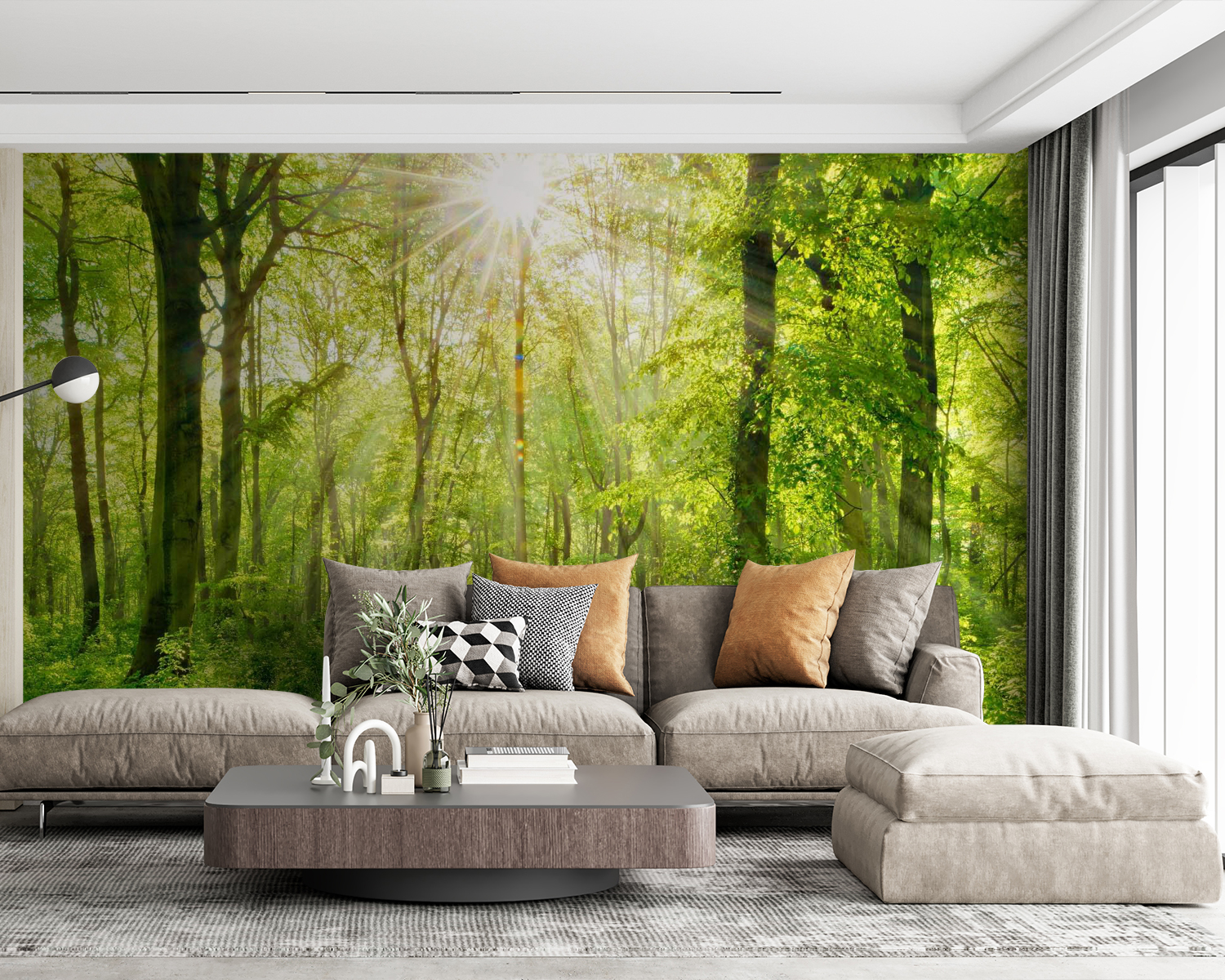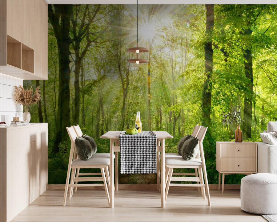 Alakítsa át terét ezzel a lenyűgöző falfestménnyel, amelyen a napsugarak buja fák között hatolnak át. Képzelje el, hogy szobájába lépve úgy érzi, mintha egy nyugodt erdőbe lépett volna – a természet tökéletes relaxációs zónájába. Az élénk zöldek felbukkannak, nyugodt hangulatot árasztanak, szinte mintha hallanád a levelek halk zizegését. Akár olvasósarok, akár élénk gyülekezőhely, ez a falfestmény elbűvölő tréfát űz az érzékekkel. Olyan, mint egy kis friss levegő a falakon, tökéletes hátteret biztosítva a meghitt beszélgetésekhez vagy a békés, egyedül töltött pillanatokhoz. Ráadásul egyszerűen jó belegondolni, hogy egy kis természet ilyen örömet tud okozni a beltérben.