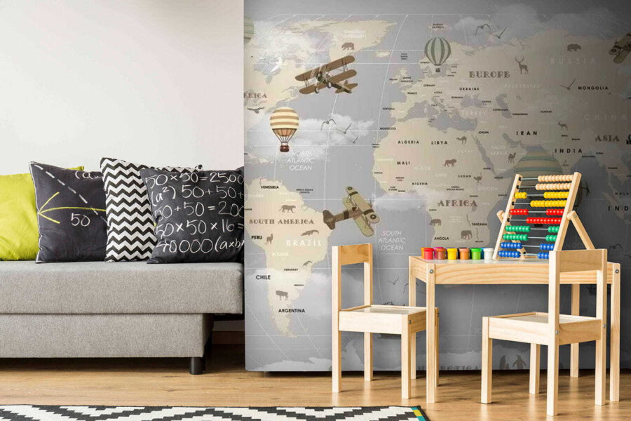 A „Világtérkép repülőgépekkel és hőlégballonokkal” faliképpel bármelyik szobát varázslatos utazássá alakíthatja. Képzelje el, hogy belép egy olyan térbe, amely finom, álomszerű színekkel és a kontinensek felett táncoló játékos mintákkal ébreszti fel utazási vágyát. Minden ballon és repülőgép egy csipetnyi kalandot ad hozzá – ki ne szeretne kávézgatás közben világutazásról álmodozni?