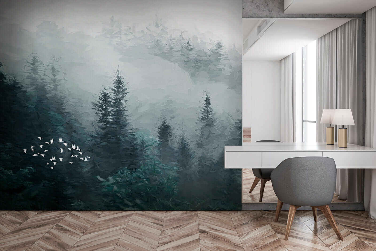 A “Ködös erdő madarakkal” falfestmény segítségével bármelyik szobát nyugodt meneküléssé varázsolhatja. Képzelje el, hogy ködös fákra és a levegőben sikló madárrajra ébred. Olyan, mintha egy kis vadságot hozna be a házba – tökéletes egy hangulatos nappaliba vagy egy nyugodt hálószobába. A zöld és a szürke nyugtató árnyalatai olyan légkört teremtenek, amely pihenésre és álmodozásra hív. Képzelje el, ahogy egy jó könyvvel összegömbölyödik, lágy zenét hallgat, és teljesen nyugodtnak érzi magát – mintha a természet nyugalma ölelné körül a falait. Egy kedves érintés azoknak, akik hűvös hangulatra vágynak anélkül, hogy a szabadba lépnének!