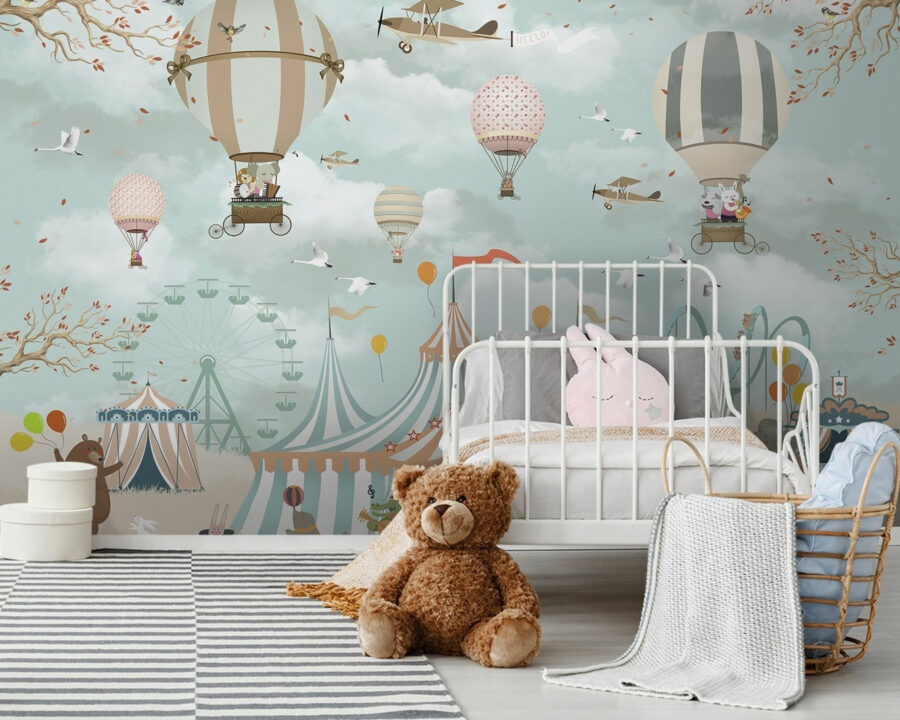 Képzelje el, hogy egy olyan térbe lép, amely olyan, mint egy szeszélyes kaland. Ez a bájos hőlégballonokat és játékos madarakat ábrázoló falfestmény egy csodálatos égboltot teremt, ahol a képzelet szárnyal. Minden egyes karakter egy kis örömet hoz, történetekre és álmodozásra késztet – legyen szó akár egy bátor elefántról, akár egy léggömbökkel teli daliás medvéről. Tökéletes a gyerekszobába vagy bármely olyan helyre, ahová jól jönne egy kis vidámság, és felidézi a cirkuszi kirándulások és a szabadban töltött napsütéses napok gyermekkori emlékeit. Alakítsa át a falat, és hagyja, hogy a varázslat szárnyaljon – ki ne szeretne elszállni e varázslatos égbolt alatt?