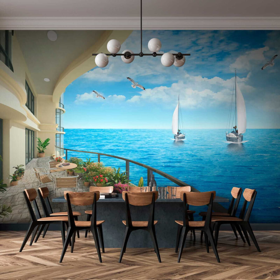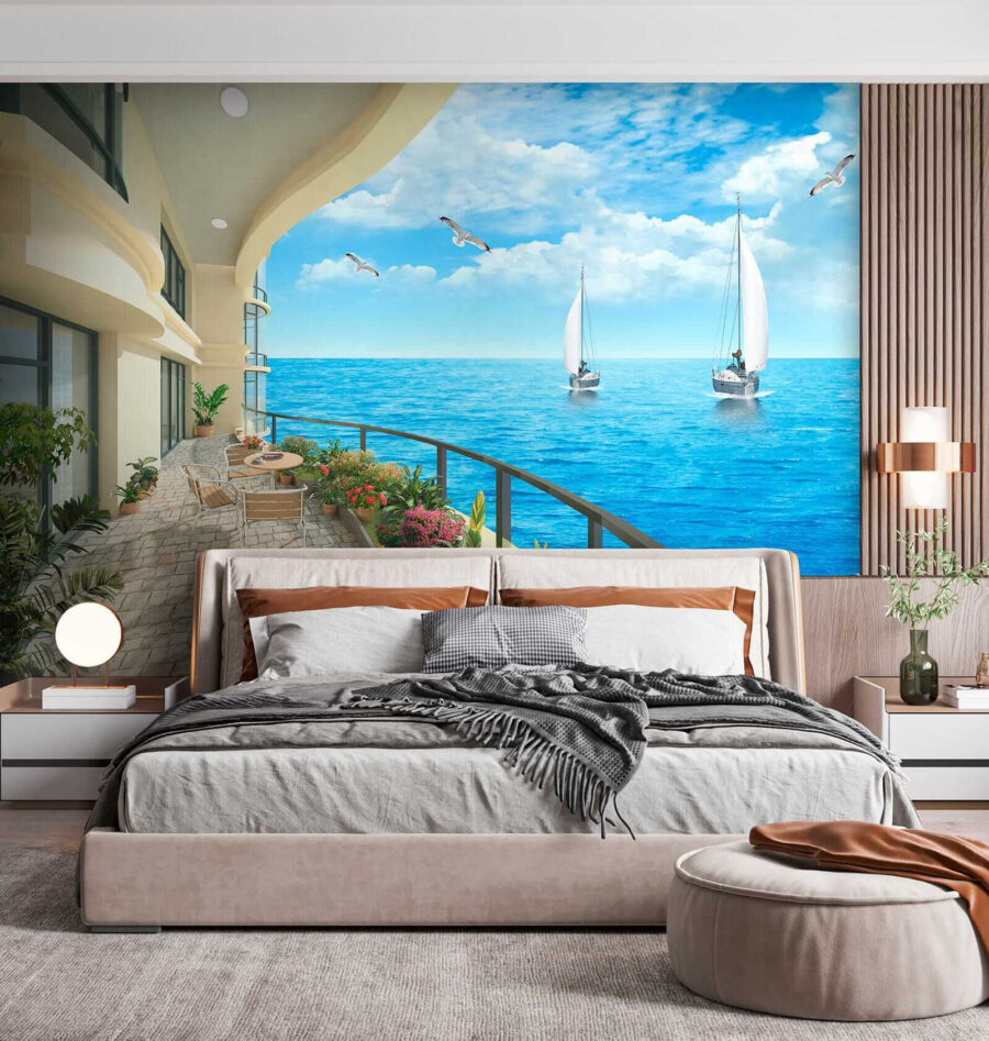 Képzelje el, hogy belép egy olyan szobába, ahol a falak az óceán szellőjét közvetlenül az érzékszerveire varázsolják. Ez a falfestmény, amely egy erkélyt ábrázol, ahonnan lenyűgöző kilátás nyílik az óceánra és a vízen lustán sodródó hajókra, bármilyen teret tengerparti menedékhellyé varázsol. Képzelje el, ahogy a reggeli kávéját kortyolgatja, miközben a szelíd hullámok és a tengeri madarak szimfóniája tölti be a levegőt – ki ne szeretné ezt? Az élénk kék színek és a buja zöld növényzet egyszerűen kikapcsolódásra hív. Olyan, mintha egy végtelen nyaralás lenne otthon, és a falaknak egy kis friss tengeri levegőt adna. Tökéletes az álmodozóknak vagy bárkinek, akinek egy kis nyugalomra van szüksége az életében. Csak akassza fel, és hagyja, hogy a hullámok elárasszák!