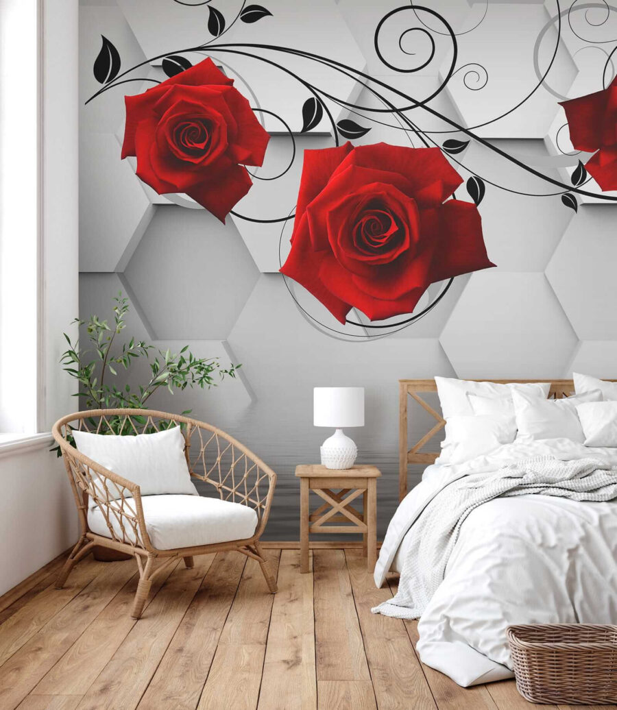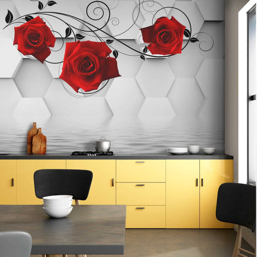 Alakítsd át a teredet ezzel a lenyűgöző faliképpel, amelyen élénk piros rózsák elegáns fekete indákkal fonódnak össze. Mintha egy virágzó kert lenne a nappalidban, csak öntözőkanna és alkalmi méhek zümmögése nélkül. A sima hatszögek háttérként modern hangulatot teremtenek, míg a rózsák romantikus hangulatot kölcsönöznek – tökéletesek egy hangulatos légkör megteremtéséhez. Legyen szó egy lusta hétvégi reggeli kávéról vagy egy élénk vacsoráról, ez a falikép pont a megfelelő hangulatot teremti meg. Ez az a fajta dekoráció, amely beszélgetéseket és talán néhány álmodozást is kivált a titkos kertekről. Ki ne érezné magát egy kicsit inspiráltabbnak, ha ezeket a szépségeket bámulja?