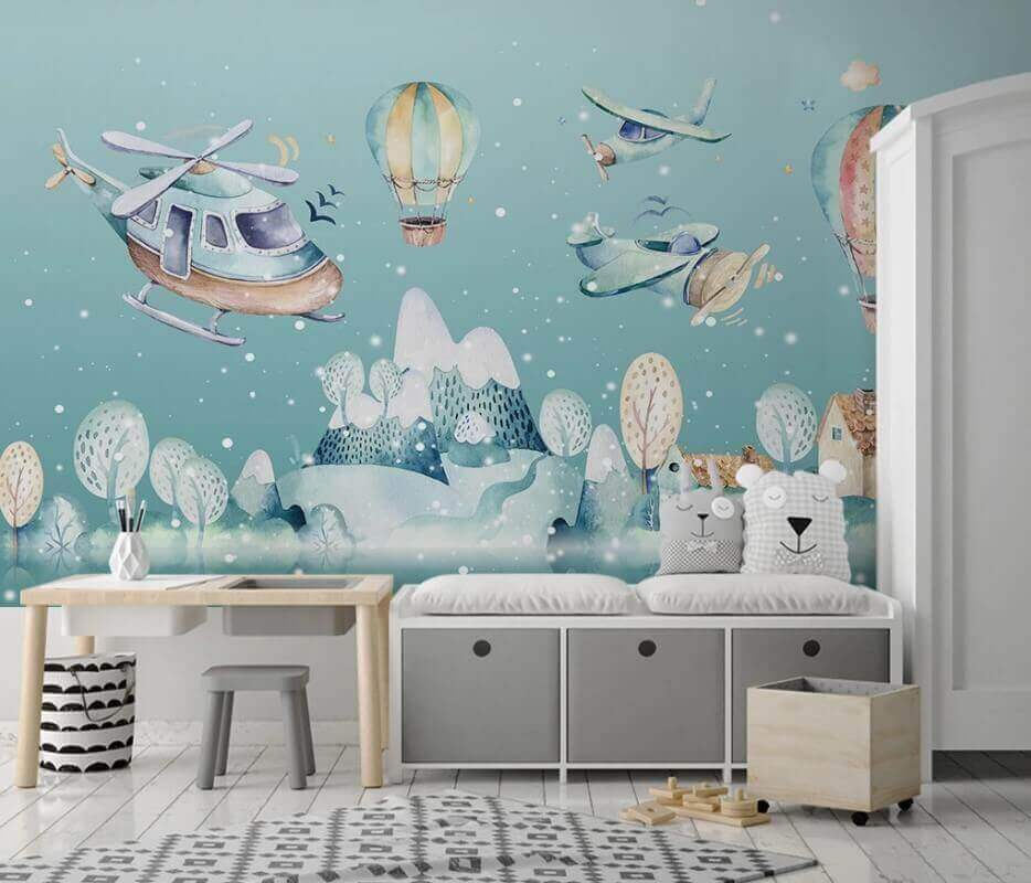 Vidám helikopterek és színes hőlégballonok díszítik ezt a bájos akvarell falfestményt, amely bármely helyiséget felvidít. Mintha egy mini kalandot élhetne át a falán! Képzelje el: a gyerekek csodálják a szeszélyes jelenetet, és arról álmodoznak, hogy magasra repülnek az égen. A lágy kék és élénk színek álomszerű hátteret teremtenek, amely egyszerre pihentető és inspiráló – tökéletes választás gyerekszobába vagy játszószobába. Ráadásul ki ne mosolyogna el, ha meglátja azokat a kis repülőgépeket? Örömöt és fantáziát ébreszt, és számtalan történetnek és végtelen szórakozásnak teremt teret. Egy kis csoda minden otthonba!