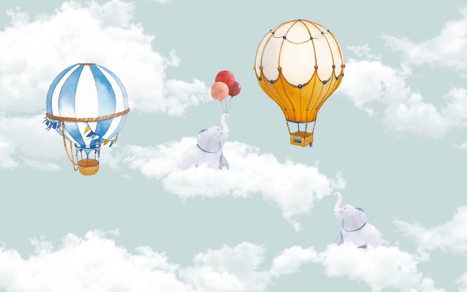Képzeld el, hogy egy gyerekszobát álomszerű kalanddá alakítasz – ez a “Hőlégballon az égen” falfestmény pont megfelelő! Képzeld el, ahogy a szeszélyes hőlégballonok a pelyhes felhőkön keresztül lebegnek, és a játékos elefántok velük tartanak, miközben édes kis léggömböket tartanak a kezükben. Mintha egy puha, pasztellszínű mesekönyvbe csöppennél… A világoskék égbolt és a szelíd fehér felhők nyugtató hangulatot árasztanak – tökéletesen alkalmas arra, hogy beindítsa a gyermek képzeletét, vagy édes álmokba ringassa őket.