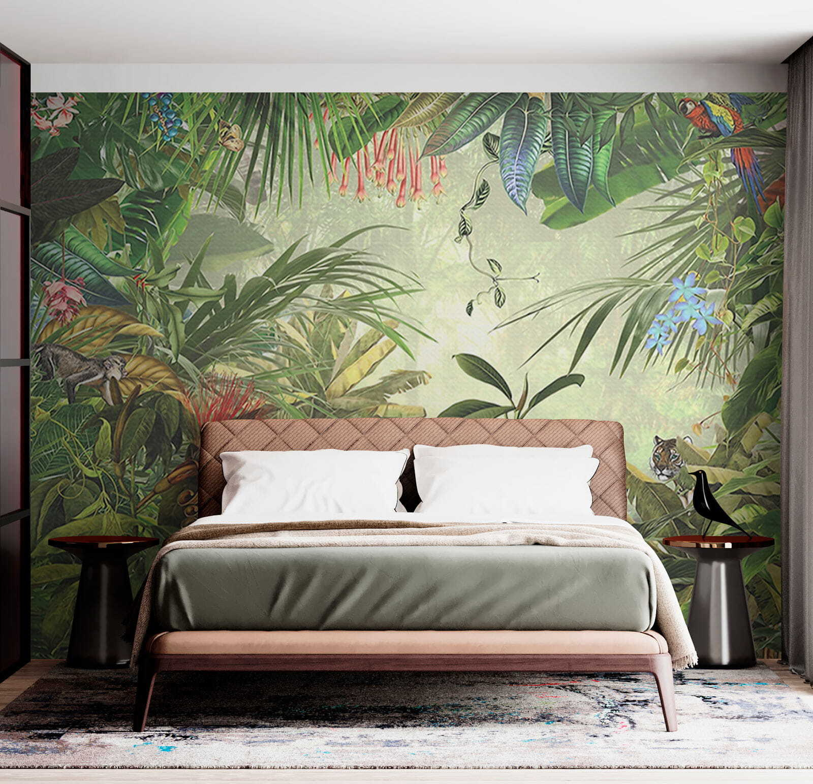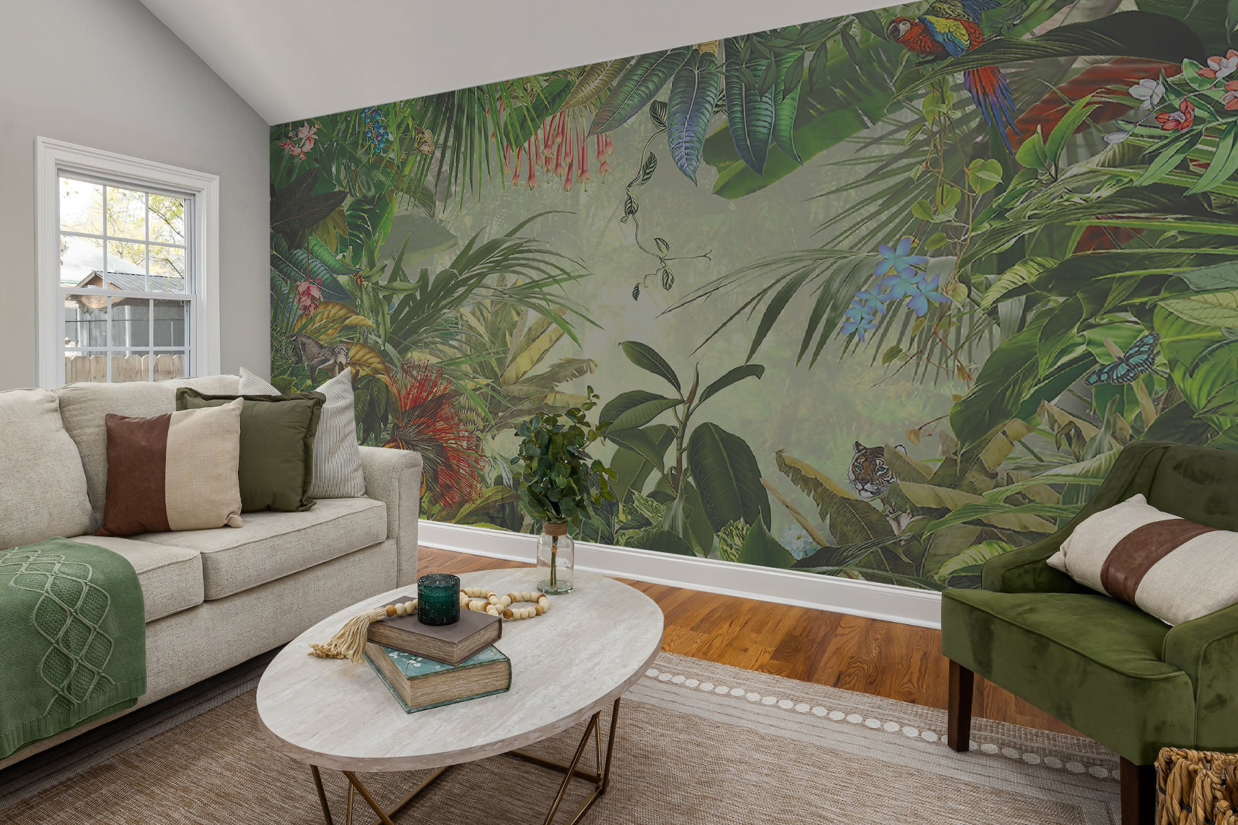 Szerette volna, ha az élettere olyan, mint egy egzotikus kaland? Ez a “Lush Jungle” falfestmény lehet, hogy pont megfelelő lesz. Képzelje el, hogy felébred, felhörpinti a kávéját, és egyenesen egy élettel teli, vibráló esőerdőbe bámul – papagájok, majmok, tigrisek… Szinte hallja a levelek zizegését, vagy érzi a dzsungel hűvös szellőjét! A színek egyszerűen csodálatos mélységűek – buja zöldek, gazdag földszínek, virágokkal tarkított színek. Tökéletes a természet szerelmeseinek, vagy bárkinek, aki otthonában egy csipetnyi vadonra vágyik. Olyan, mint egy kis menekülés, egyenesen a faladon!🌿🦜