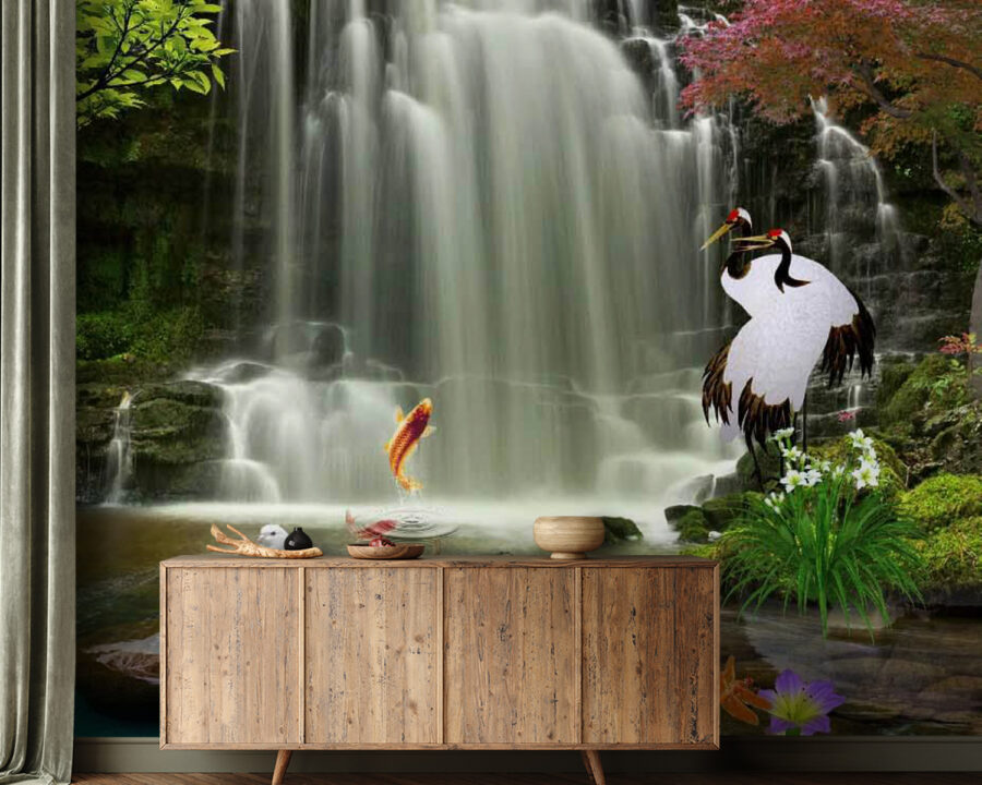 Ezzel a lenyűgöző vízeséses falfestménnyel bármelyik szobát nyugodt oázissá varázsolhatja. Az életerővel teli képeken játékos koi halak, repülés közbeni elegáns madarak és élénk növényzet látható, amelyek a természetet közvetlenül a falaira varázsolják. Képzelje el: egy hangulatos olvasósarok, ahol a vízesés nyugtató hangja betölti az elmét, míg a gazdag zöldek és lágy kékek elrepítik Önt egy nyugodt menedékbe. Mintha otthon lenne egy mini-vakációja – repülőjegy nélkül. Tökéletes azok számára, akik értékelik a szépséget és a nyugalmat, ez a falfestmény egy kis szeszélyességet és csodát ad hozzá, ami mosolyt csal az arcára minden alkalommal, amikor elhalad mellette. Bízzon benne, hogy felvidítja minden unalmas napot!