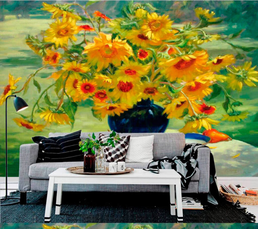 Bármelyik helyiséget vidám hellyé varázsolhatja ezzel a lenyűgöző falfestménnyel, amely egy sárga virágokkal és élénk gyümölcsökkel teli vázát ábrázol. Képzelje el, hogy erre a napsütéses jelenetre ébred – olyan, mintha a természet egy kis darabkája lenne az otthonában. Tökéletes színfoltja a konyhának, vagy feldobja a hangulatos nappalit. Az élénk részleteknek köszönhetően szinte háromdimenziósnak tűnik, vonzza a tekintetet, és könnyen elmerülhetsz a szépségben. Ráadásul remek beszélgetésindító. Ki ne akarna beszélgetni arról, hogy milyen nagy örömet okoznak ezek a vidám virágok? Egy csipetnyi báj, egy csipetnyi szeszély – ez a falfestmény biztosan feldobja a hangulatot és mosolyt csal az arcokra.
