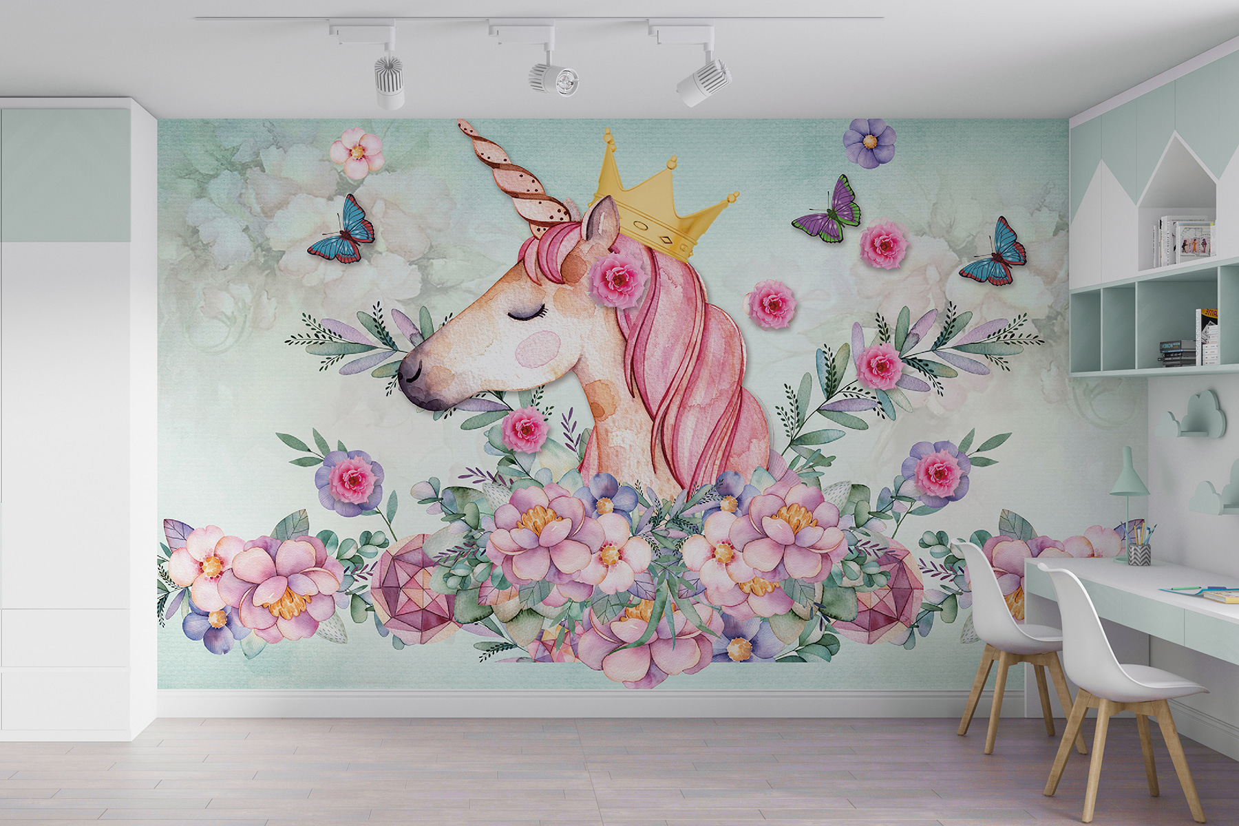 Üdvözölje a szeszélyes varázslatot gyermeke szobájában ezzel a varázslatos falfestménnyel! A kecses, koronás egyszarvút ábrázoló, finom virágokkal és rebbenő pillangókkal körülvett falfestmény minden nap olyan, mintha egy tündérmesébe lépne be. Képzeld el, ahogyan kisgyermeked szeme felcsillan az örömtől és a csodálkozástól – abszolút boldogság!