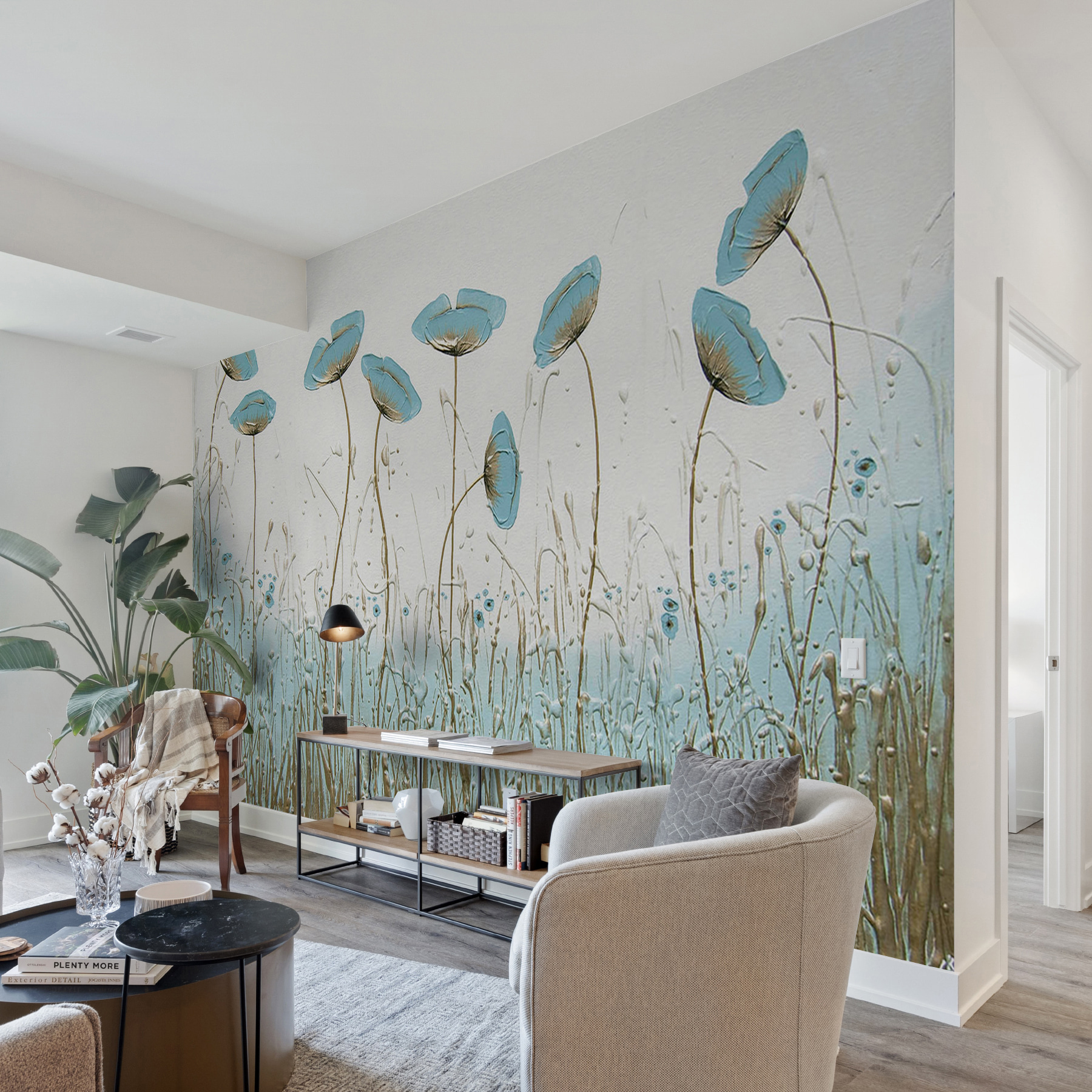 Szerette volna valaha is a természetet a belső térbe vinni? Ez a lenyűgöző falfestmény lehet a válasz. Képzelje el – finom kék virágok lágyan ringatóznak, mintha éreznék, ahogy a lágy szellő végigsimít rajtuk. Azonnal megnyugtató, igaz?