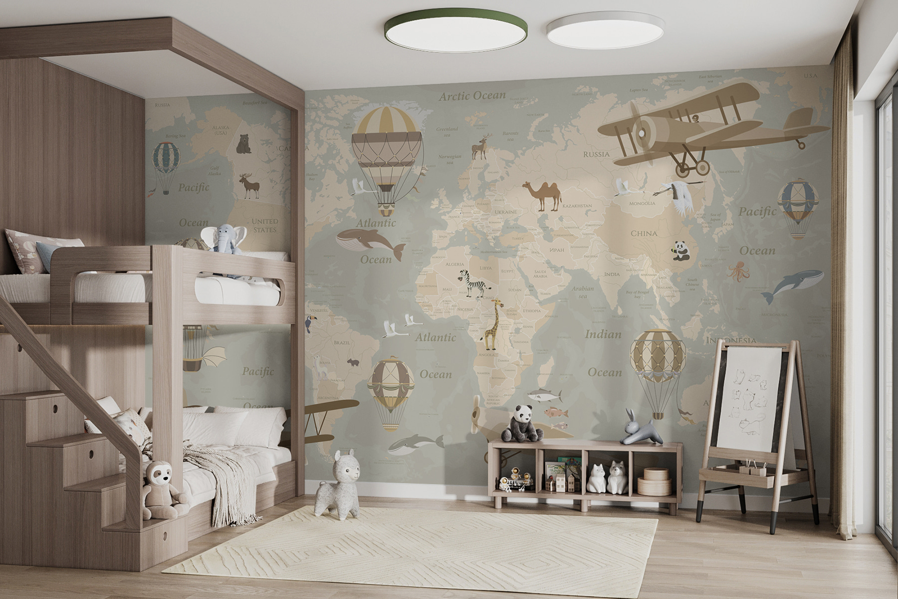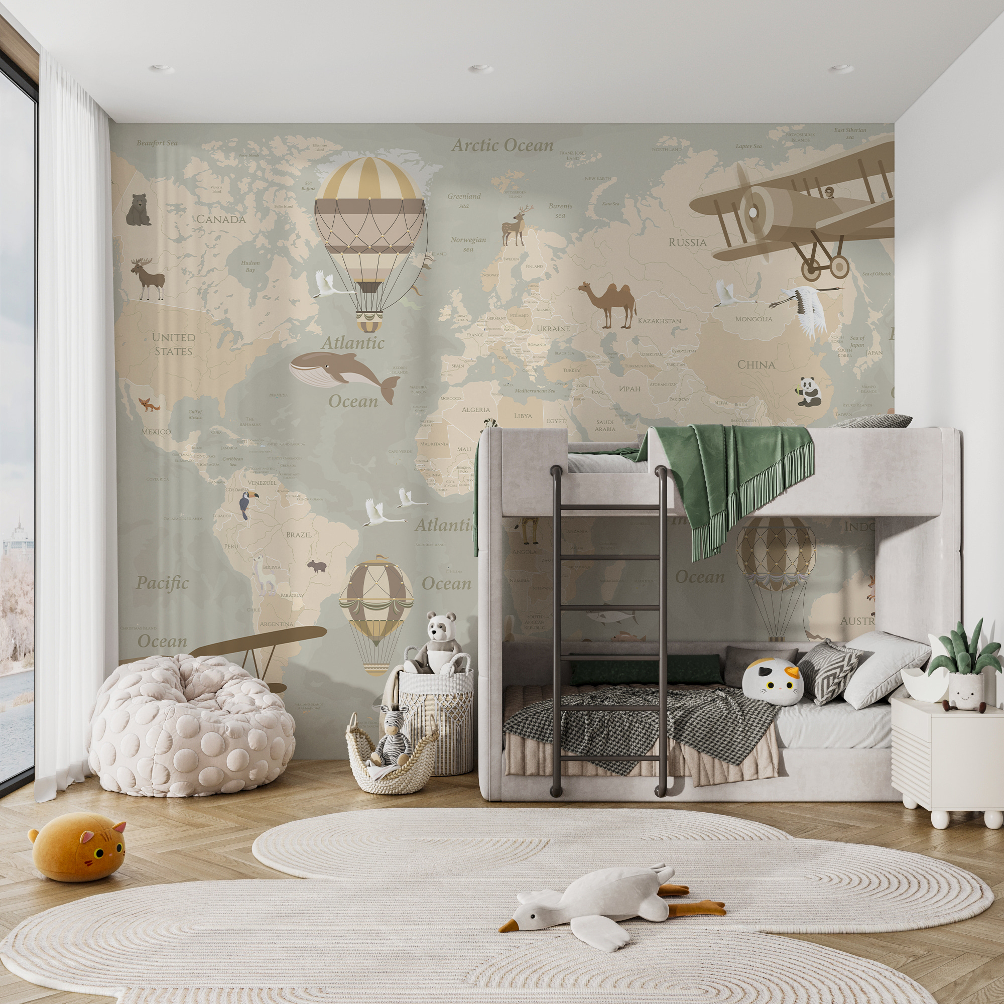 Képzeld el, ahogy a kis felfedezőid képzeletbeli kalandokra indulnak – egyik nap egy kétfedelű repülőgépen repülnek Afrika felett, a következőn pedig egy hőlégballonban lebegnek Ausztrália felett. Tökéletes a kíváncsiság felkeltésére és a falak álmok vásznává változtatására. Ráadásul olyan kedves vintage hangulata van, amelyet a felnőttek is értékelni tudnak – mint egy műalkotást és egy földrajzórát egyben. Szeszélyes, mégis tanulságos, így minden pillantás egy mini vakációvá válik. Miért érné be egyszerű falakkal, amikor egy egész világ vár felfedezésre?