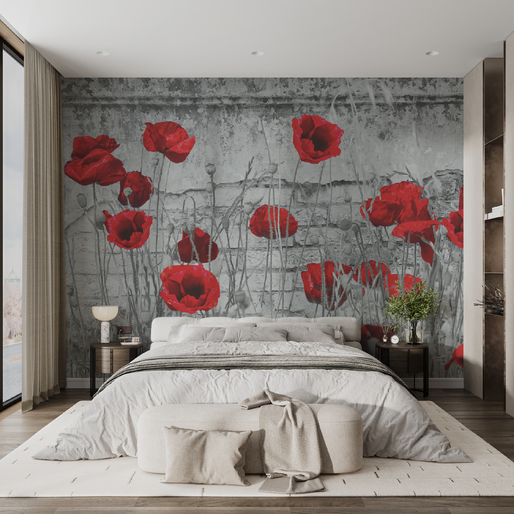Képzelje el, hogy belép egy szobába, és azonnal élénk, piros pipacsok látványa fogadja egy rusztikus, időjárásfüggő falon. Ez a freskó olyan, mint egy gyönyörű titkos kert, amibe a város közepén belebotlasz. Minden a kontrasztról szól – tüzes virágok egy durva háttérrel szemben, olyan hangulatot teremtve, amely egyszerre hangulatos és éles. Gondolj bele: minden pillantás ezekre a vibráló szirmokra feldobhatja a hangulatot, különösen egy esős napon. Ideális választás azoknak, akik szeretik a természetet és egy csipetnyi drámát a dekorációjukban. Ráadásul ki ne szeretné magát egy kicsit művészinek érezni minden alkalommal, amikor elsétál mellette? És hé, ez sokkal kevésbé karbantartandó, mint egy valódi kert!