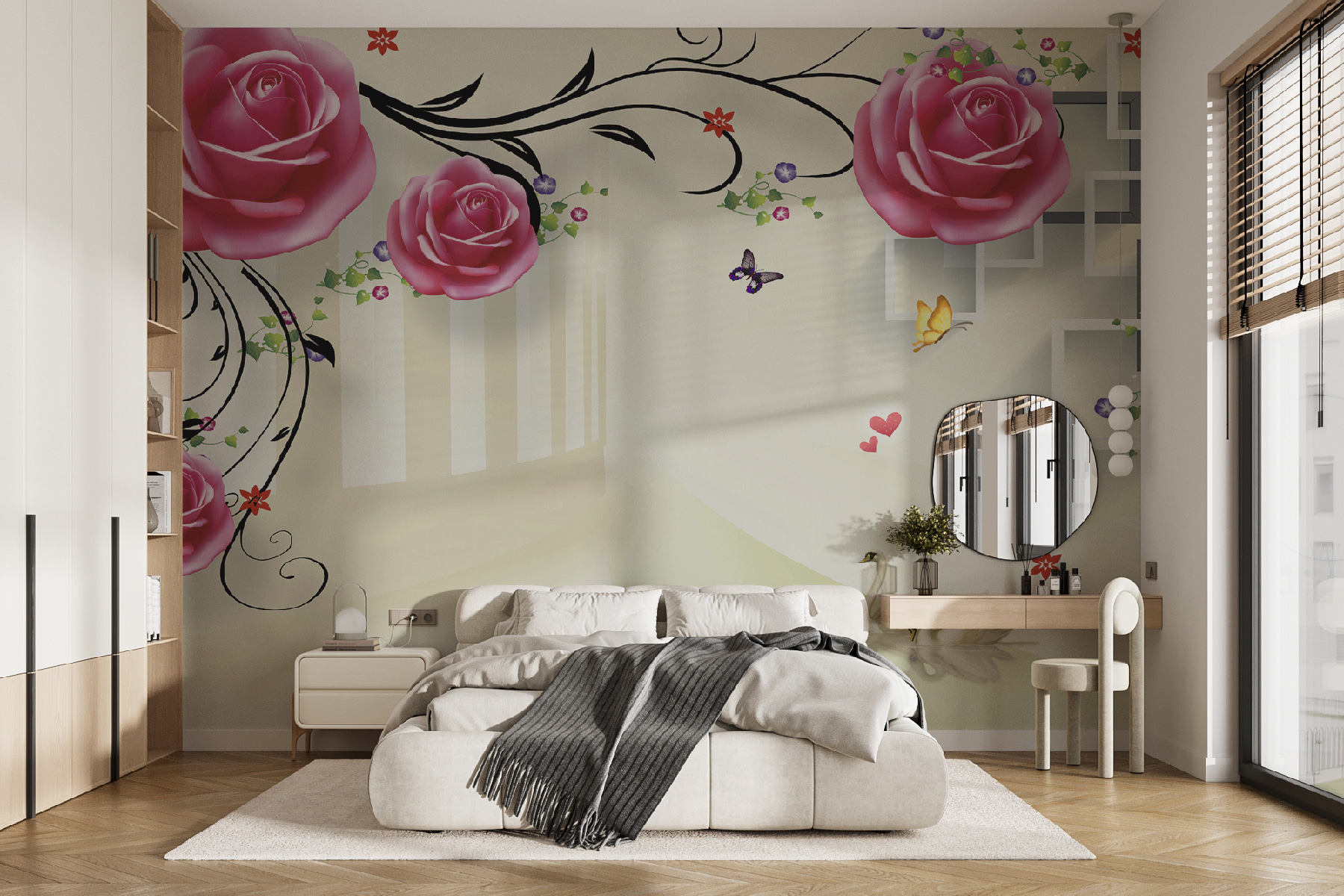 Képzelje el, hogy minden nap erre a lenyűgöző freskóra ébred – mintha egy álomszép kertbe lépne! A virágzó rózsaszín rózsák alatt kecsesen sikló hattyúk és a körülöttük repkedő pillangók egy kis nyugodt varázslatot kölcsönöznek a helyiségednek. Tökéletes mindenkinek, aki a természet egy darabját szeretné bevinni a belső térbe egy kis eleganciával. És azok a rózsák – szinte úgy néznek ki, mintha meg tudnád érinteni őket!