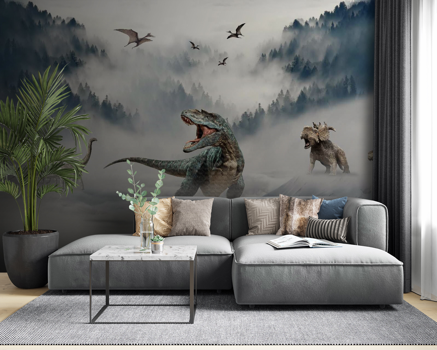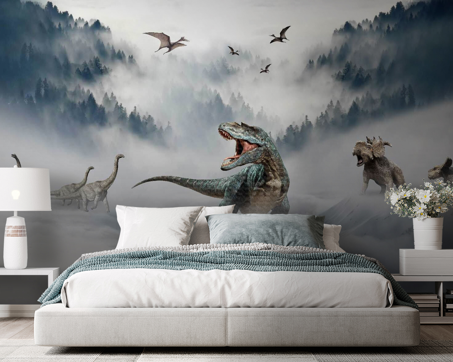 Van otthon egy dínórajongó? Ez a “Dinoszaurusz nyitott szájjal” fali falfestmény lehet, hogy az agyukat is elszállítja! Képzeld el: vad T-Rex üvölt ködös, sűrű erdők között, a háttérben hosszúnyakú pajtásokkal és repülő őslénypajtásokkal. Tökéletes gyerekszobákba, játszószobákba, vagy bárkihez, aki szeret egy kis Jurassic-izgalmat a dekorációjában. Képzeld el a kis látogatók ámuló lélegzetvételét – és az azt követő játékos üvöltést! Ez a falfestmény nem csak egy fal, hanem egy kaland, amely csak arra vár, hogy megtörténjen. Merész, vad, és készen áll arra, hogy visszarepítsen az időben! 🦖🌲