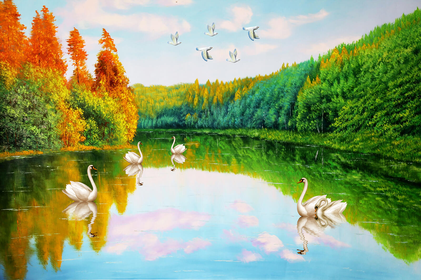 Bármely helyiséget nyugodt oázissá varázsolhat ezzel a gyönyörű faliképpel, amelyen kecses hattyúk siklanak egy csendes tó felett. A vibráló zöldek és a meleg őszi színek elbűvölő összhangja lenyűgöző hátteret teremt, amelynek látványától nehéz nem elmerülni a vízparton töltött lustálkodós délutánokról szóló álmodozásban. Képzelje el, ahogy teát kortyolgat és elmerül a gondolataiban, miközben ezek az elegáns madarak elúsznak mellette. Mintha egy darabka természetet hozna be a lakásába – szúnyogok nélkül! Ez a tapéta, amely tökéletesen illik nappalikba vagy hangulatos sarkokba, békét és varázst sugároz, és gyengéd nyugalmat csempész a mindennapokba. Ráadásul ki ne szeretne úgy érezni, mintha egy rejtett tavi paradicsom közelében élne?