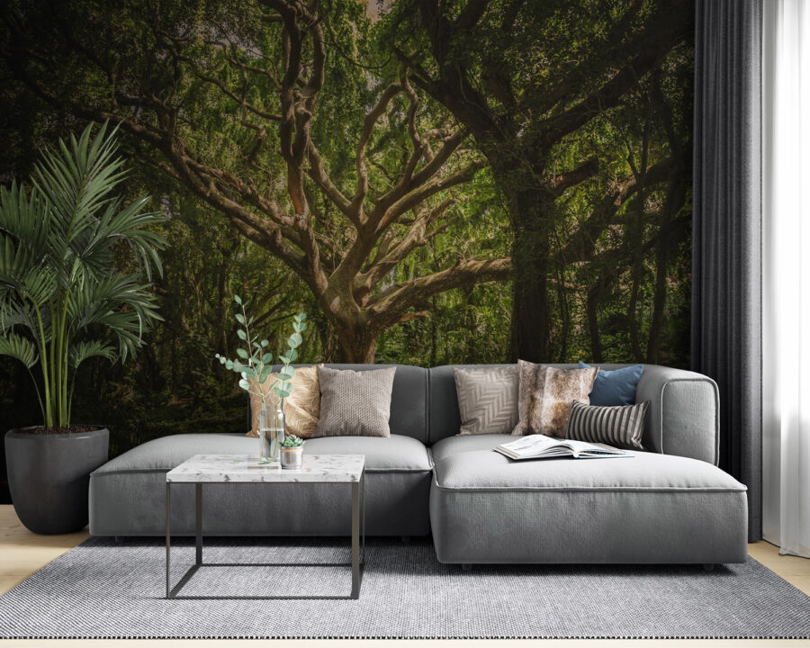 Bármely helyiséget nyugodt menedékké varázsolhat ezzel a lenyűgöző faliképpel, amelyen egy buja erdőben álló hatalmas fa látható. A gazdag zöld és földes barna színek nyugtató hatást keltenek, így még a legkisebb szobák is a természet meleg öleléséről adnak. Képzelje el, hogy reggel felébred, és a levelek lágy lengése fogadja, mintha a természet saját táncpartit rendezne. Ez a tapéta tökéletes hangulatos sarkokba vagy otthoni irodákba, és azt suttogja: „Pihenj, erdőben vagy!” Ráadásul remek módja annak, hogy a szabad levegőt behozza a lakásba – anélkül, hogy a szúnyogokkal kellene foglalkoznia. Emelje ki a falakat, és hagyja, hogy a dekoráció lélegezzen!