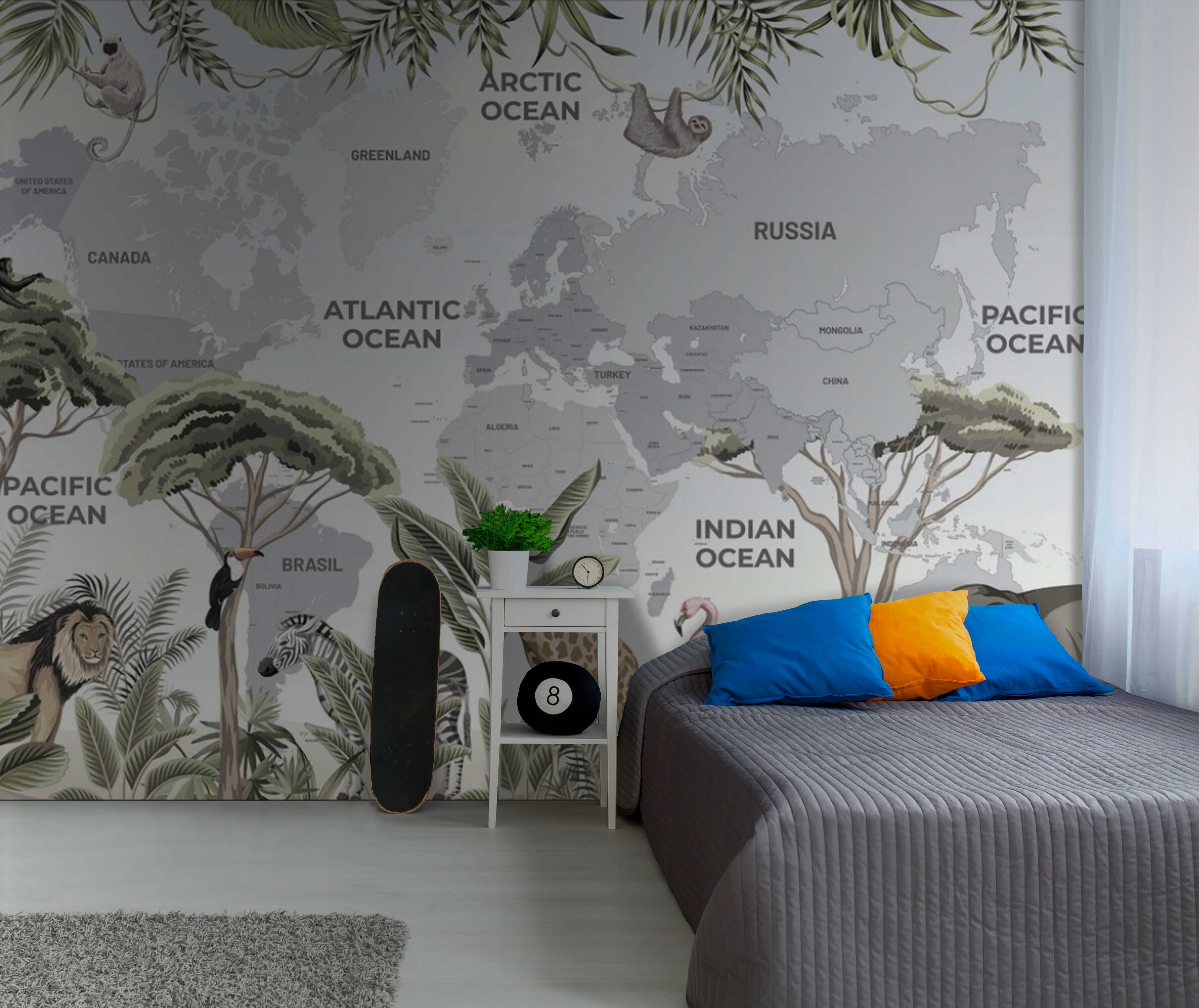 Képzelje el, hogy ezzel a bájos falfestménnyel a vadon egy szeletét hozza be a helyiségébe! A “Zsiráf áll egy fa mellett” tökéletesen ötvözi a bájos állatokat egy világtérképes háttérrel. Olyan, mint egy mini szafari – jetlag nélkül. Képzeld el, ahogy a kicsik megcsodálják a zsiráfot, kiszúrják a flamingót, kitalálják a kontinenseket… mindezt úgy, hogy közben a legmesésebb módon tanulnak földrajzot. Minden egyes alkalommal, amikor elsétálsz mellette, nem tudod megállni, hogy ne mosolyogj a körülötted lógó játékos lajhárra. Ez nem csak egy falfestmény – ez egy beszélgetésindító, álmodozásra késztető, egy kis szelet kaland! Tökéletes gyerekszobákba, tele van bájos részletekkel, amelyek növelik a kíváncsiságukat a világ iránt.