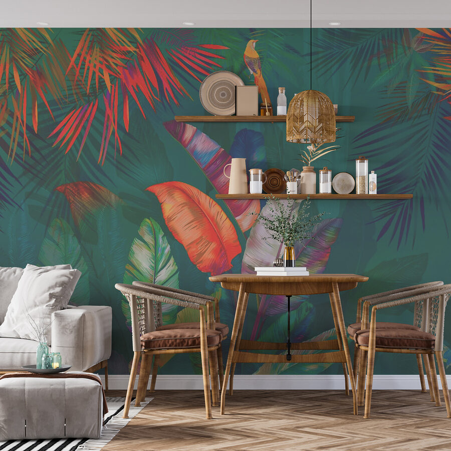 A meleg narancssárgák, a hűvös zöldek és a lila és rózsaszín játékos árnyalatainak keveréke a kaland és a nyugalom érzetét kelti egyben. Őszintén szólva, olyan, mintha a reggeli kávét egy dzsungelben fogyasztanád! Tökéletes mindenkinek, aki belefáradt az unalmas, unalmas falakba – ez a falfestmény lesz a kedvenc falfestménye. Merj elszakadni a hétköznapoktól, és hozz egy csipetnyi vadságot otthonodba… Készen állsz arra, hogy szobád azt mondja: “Üdvözöllek a dzsungelben!”?