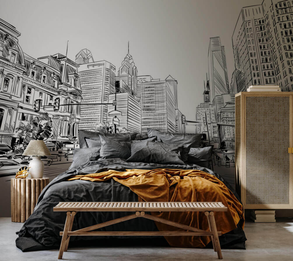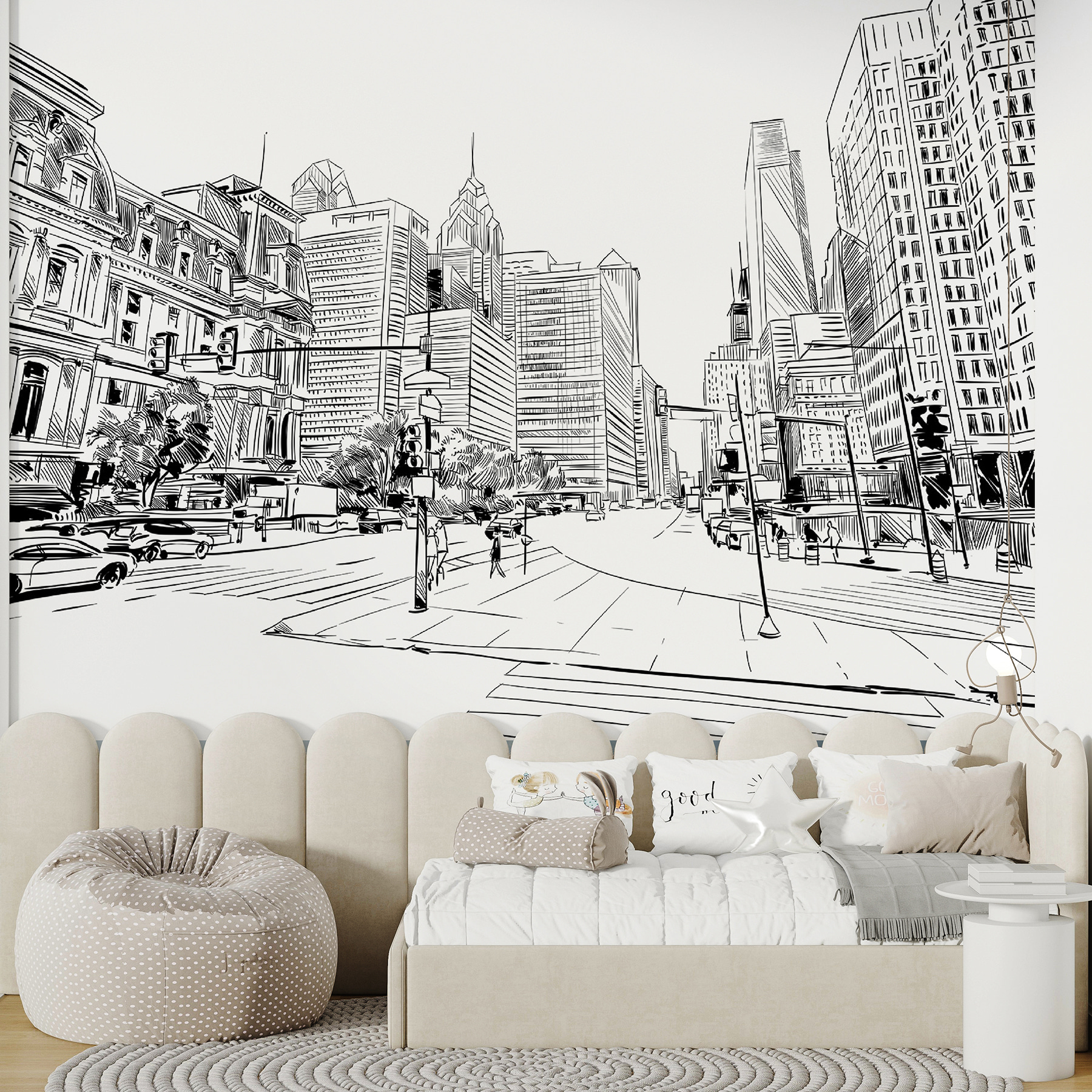 Sziasztok! Nézd meg ezt a klassz falfestményt – ez egy fekete-fehér vázlat egy városképről, amely úgy néz ki, mintha egyenesen egy képregényből származna. El tudod képzelni, hogy erre ébredsz? Olyan, mintha egy nyüzsgő város lenne a nappalidban, a zaj és a tömeg nélkül. Tökéletes, hogy egy kis városi sikket varázsolj a teredbe, igaz?