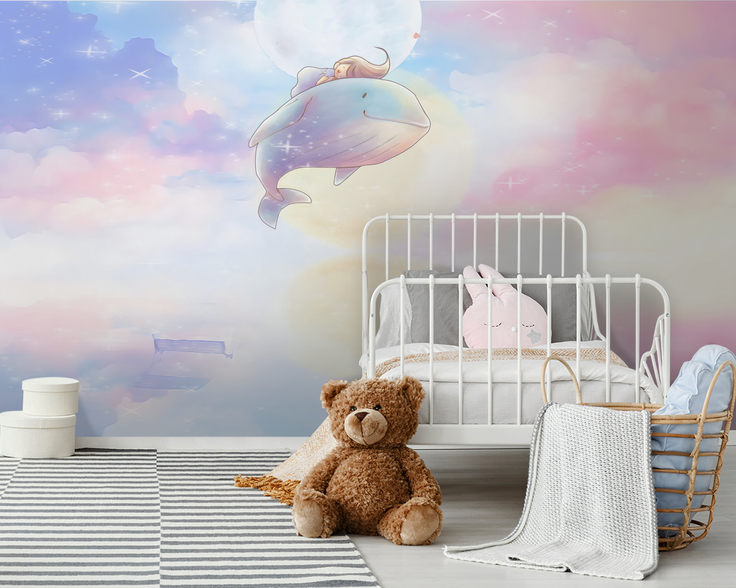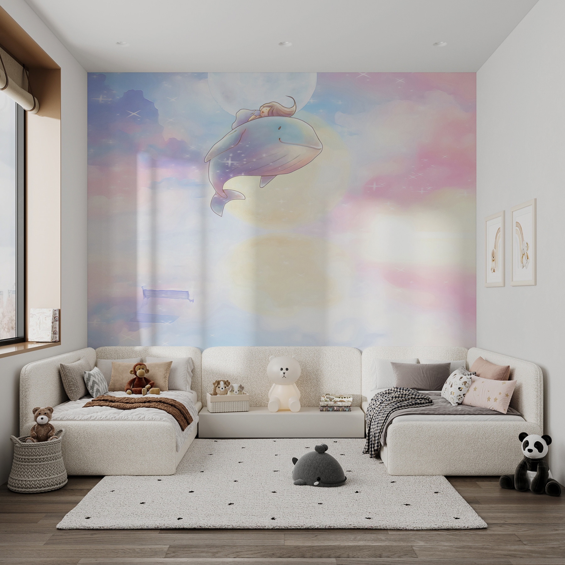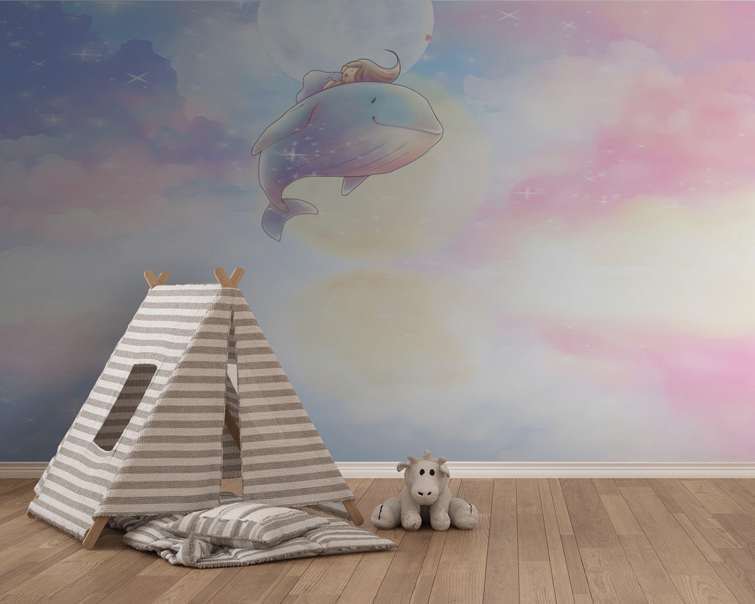 Ismerd meg az új fal legjobb barátodat – a “Cartoon of a Whale” falfestményt! Ez az álomszép jelenet olyan, mint egy édes kis utazás egy varázslatos világba, ahol egy barátságos bálna kíséri a gyereket a pelyhes pasztellfelhőkön keresztül. Tökéletes a lánya szobájába vagy bármilyen kreatív térbe!