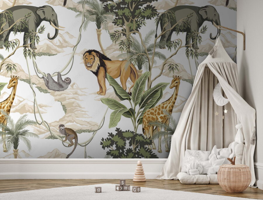 Alakítsd szobádat dzsungel kalanddá ezzel az élénk faliképpel. Képzeld el, ahogy kávét kortyolgatsz, miközben egy oroszlán nyugodtan figyel mindent, vagy egy lajhár ad neked a világ leglassabb pacsiját. A beleskelő zsiráfok és a fenséges hangulatot kölcsönző elefántok mellett nehéz nem érezni a vad inspiráció szikráját! Tökéletes azoknak a hangulatos sarkoknak vagy kiemelt falaknak, amelyekre ráférne egy kis élet. Képzelje el, milyen történeteket fog mesélni – vendégei minden alkalommal felfedezőknek fogják érezni magukat, amikor belépnek a helyiségbe. Hozza be a szabad levegőt, a szúnyogok nélkül!