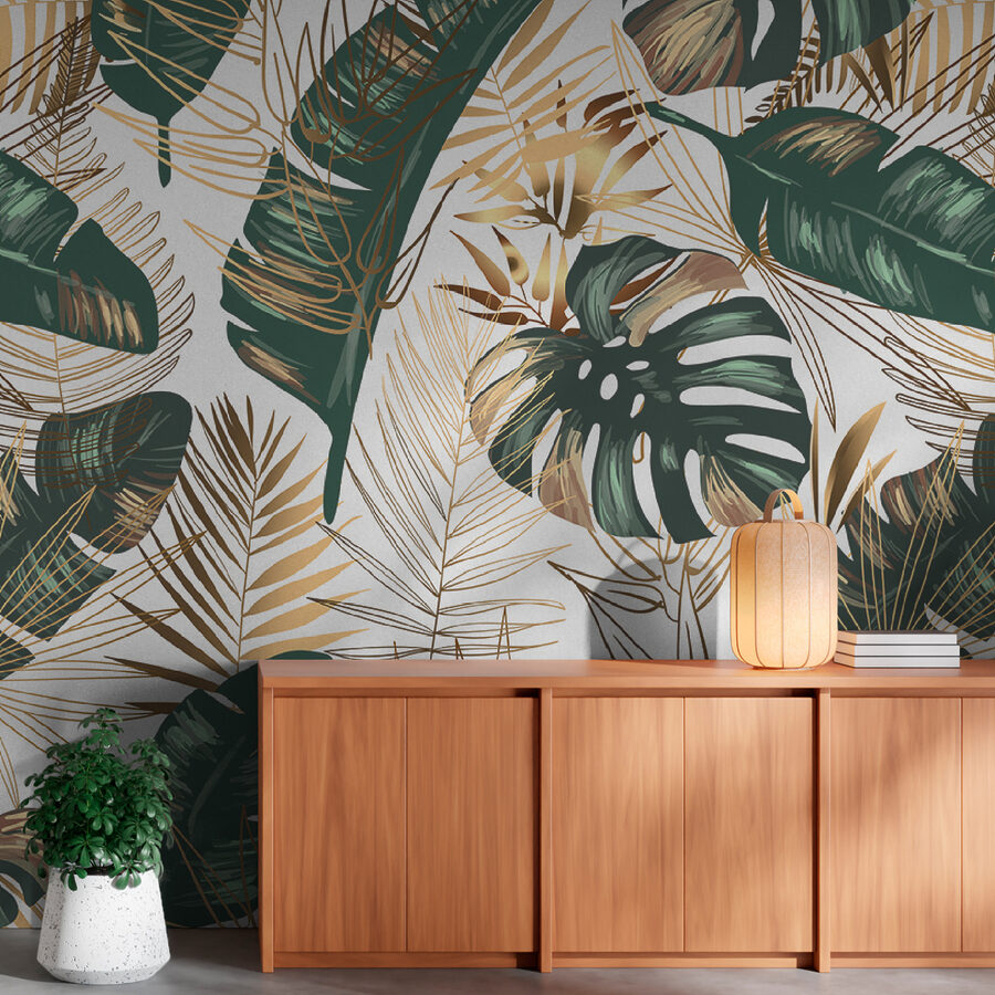 Alakítson át bármilyen szobát trópusi paradicsommá ezekkel a buja levelekkel és játékos absztrakt mintákkal díszített élénk falfestményekkel. Képzelje el, hogy belép a nappalijába, és úgy érzi, mintha egy szellős szigetre érkezett volna – ezek a zöldek és aranyak egyszerűen kikapcsolódásra hívnak. Legyen szó egy hangulatos olvasósarokról vagy egy élénk baráti összejövetelről, ez a falfestmény tökéletes személyiséget kölcsönöz. Olyan, mint egy szelíd emlékeztető, hogy lassítson le és élvezze a körülötte lévő szépséget. Ki ne szeretne egy italt kortyolgatni, és úgy tenni, mintha éppen otthon nyaralna?