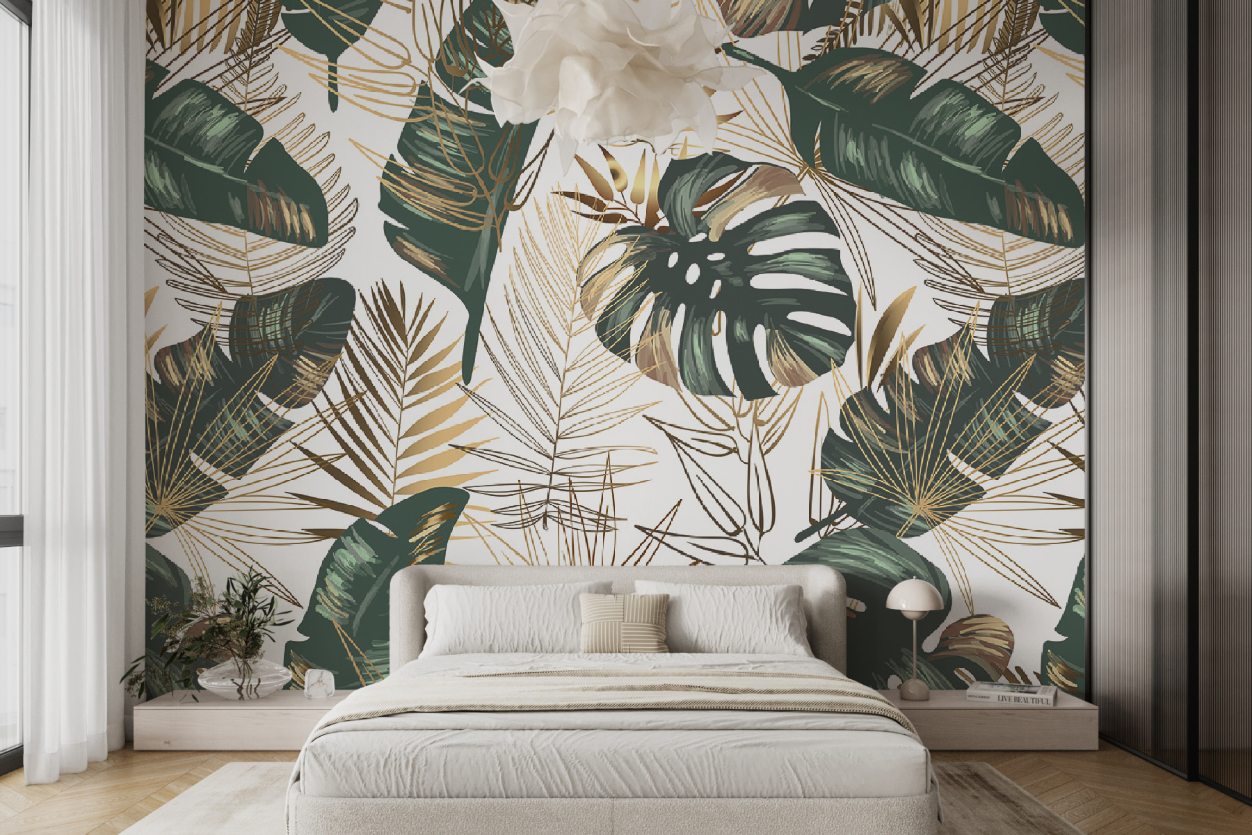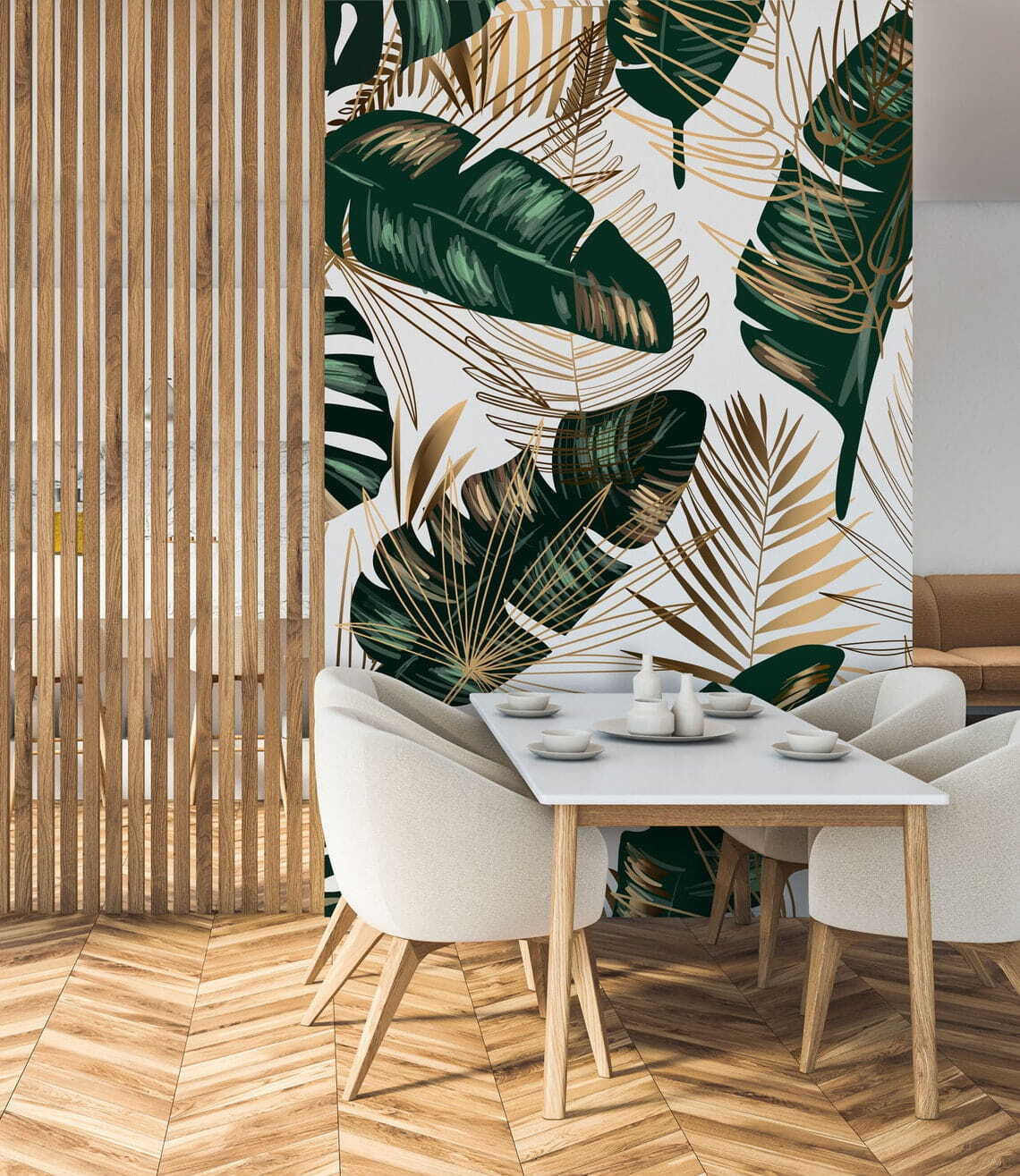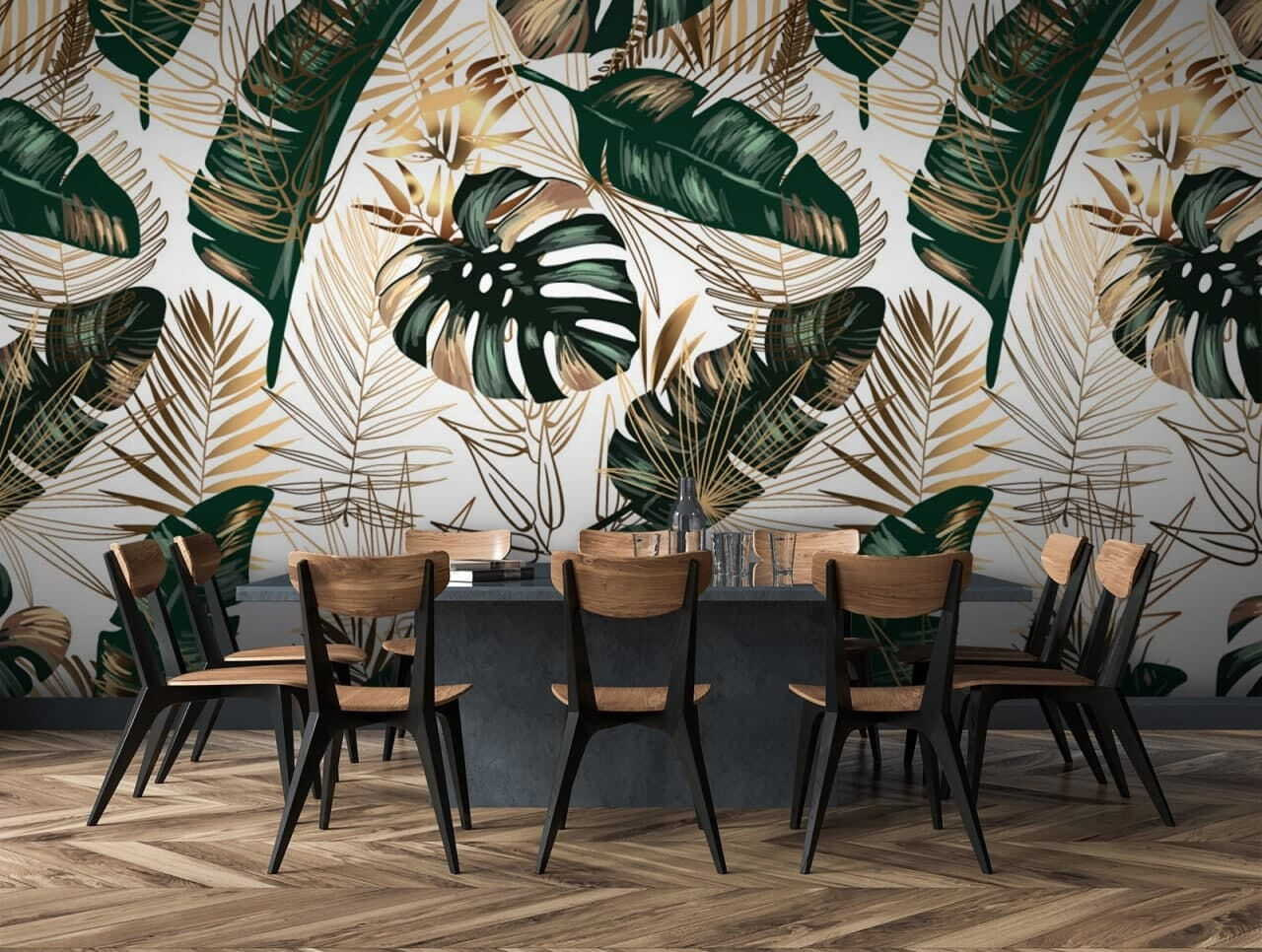 Alakítson át bármilyen szobát trópusi paradicsommá ezekkel a buja levelekkel és játékos absztrakt mintákkal díszített élénk falfestményekkel. Képzelje el, hogy belép a nappalijába, és úgy érzi, mintha egy szellős szigetre érkezett volna – ezek a zöldek és aranyak egyszerűen kikapcsolódásra hívnak. Legyen szó egy hangulatos olvasósarokról vagy egy élénk baráti összejövetelről, ez a falfestmény tökéletes személyiséget kölcsönöz. Olyan, mint egy szelíd emlékeztető, hogy lassítson le és élvezze a körülötte lévő szépséget. Ki ne szeretne egy italt kortyolgatni, és úgy tenni, mintha éppen otthon nyaralna?