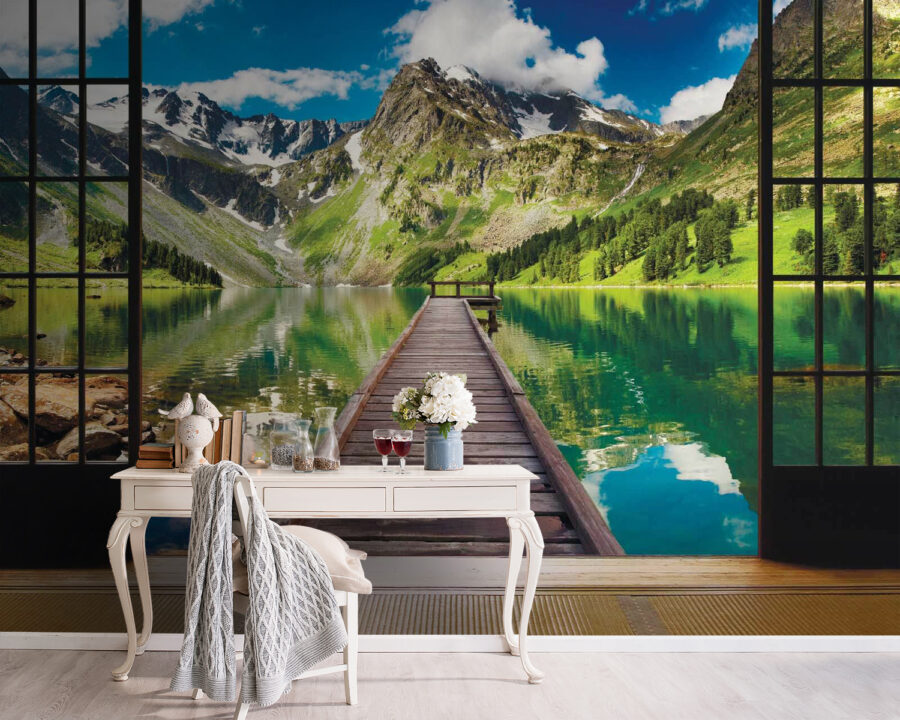 Szeretne egy kis természetet a nappalijába? Nézze meg ezt a lenyűgöző falfestményt: “Fából készült dokk egy tó felett, a háttérben hegyekkel”. Olyan, mintha egy titkos ablakod lenne egy nyugodt hegyi rejtekhelyre. Képzelje el, ahogy kilép egy fából készült stégre, a hűvös szellő lágyan felborzolja a haját, miközben fenséges hegyek ölelik körül a horizontot. Tökéletes mindenkinek, aki friss levegőre vágyik anélkül, hogy elhagyná otthonát.