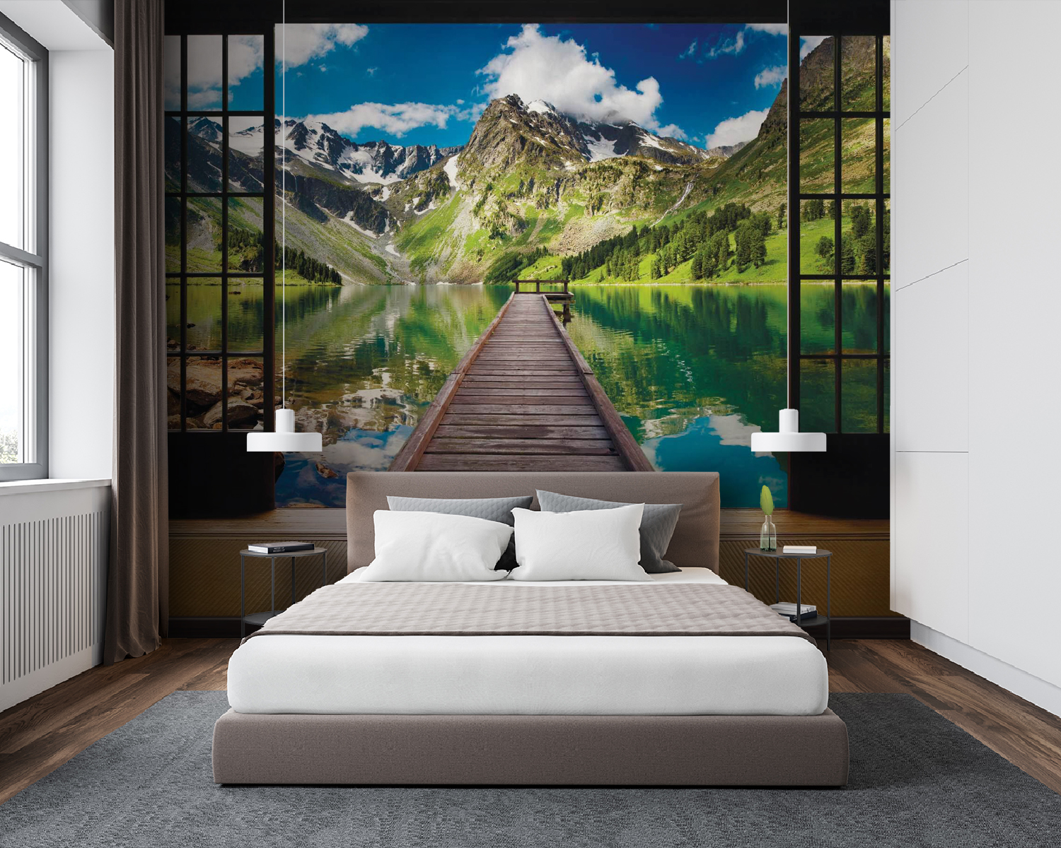 Szeretne egy kis természetet a nappalijába? Nézze meg ezt a lenyűgöző falfestményt: “Fából készült dokk egy tó felett, a háttérben hegyekkel”. Olyan, mintha egy titkos ablakod lenne egy nyugodt hegyi rejtekhelyre. Képzelje el, ahogy kilép egy fából készült stégre, a hűvös szellő lágyan felborzolja a haját, miközben fenséges hegyek ölelik körül a horizontot. Tökéletes mindenkinek, aki friss levegőre vágyik anélkül, hogy elhagyná otthonát.