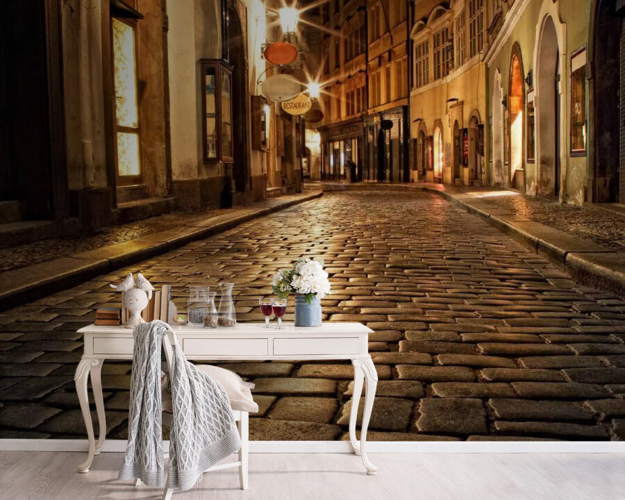 Ezzel a „Kőutca épületekkel és utcai lámpákkal” című falfestménnyel bármelyik szobát egy hangulatos város hangulatos sarkává varázsolhatja. Képzelje el, hogy belép egy olyan jelenetbe, ahol a macskakövek lágy utcai lámpák fényében csillognak. Mintha egy szeszélyes éjszakai sétát invitálna be otthonába. A meleg színek nosztalgikus érzést keltenek, így tökéletesek egy étkező sarokhoz vagy egy pihentető olvasósarokhoz. Képzelje el, ahogy egy könyvvel a kezében, kedvenc teáját kortyolgatva kucorog, miközben körülveszi az esti séták megnyugtató hangulata. Tökéletes azok számára, akik egy kis városi varázslatra vágynak!