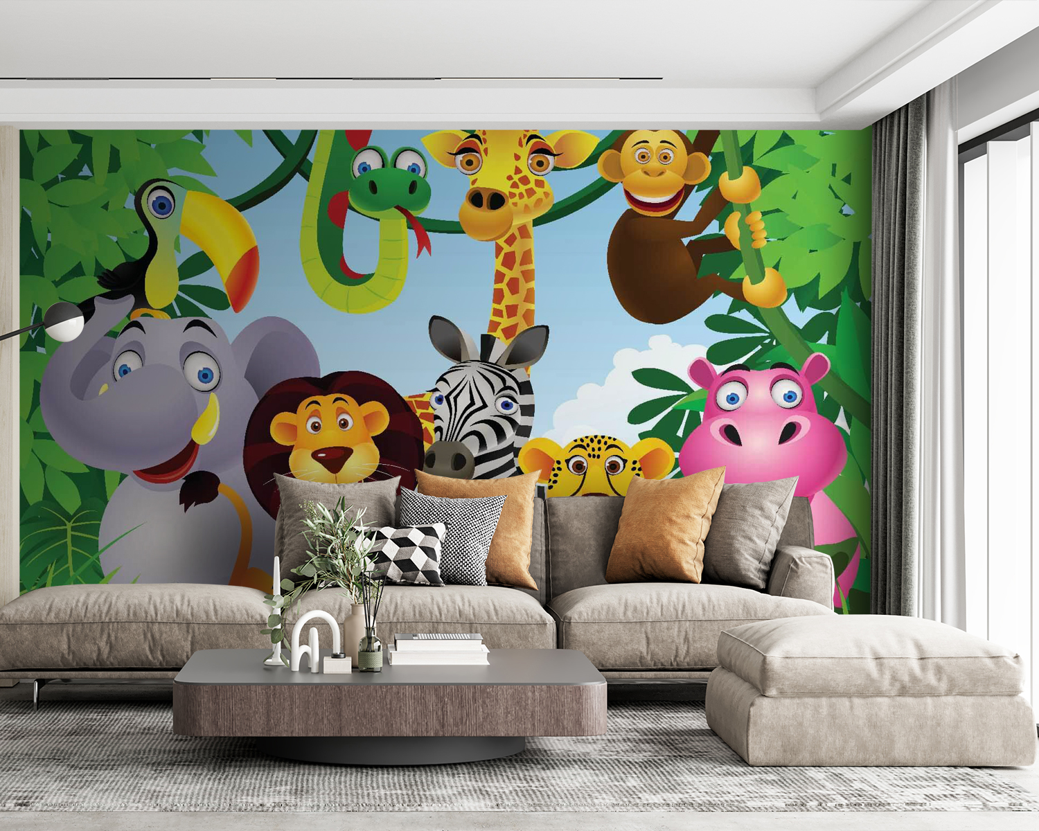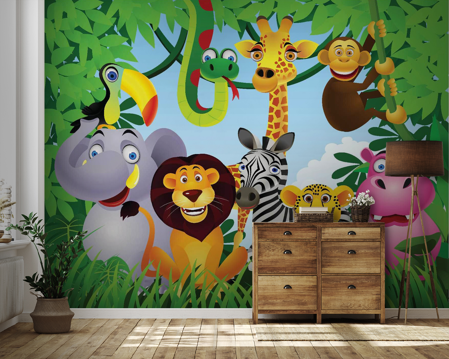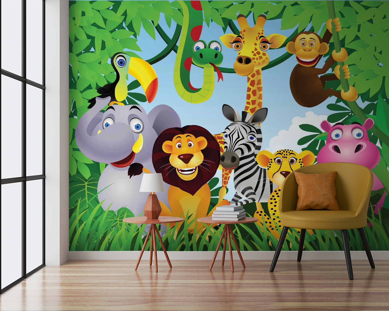 Bármely helyiséget élénk dzsungelkalanddá varázsolhat ezzel a vidám faliképpel, amelyen élénk állatok társasága látható. Képzelje el egy buta mosolyú elefántot, egy táncoló zsiráfot és egy bölcs öreg oroszlánt – mindegyikük tele van személyiséggel! Ez a falikép nem csak dekoráció, hanem a képzelet kapuja is. A gyerekek imádni fogják kedvenc állataikat keresni, míg a felnőttek talán megpillanthatják belső gyermeküket. Tökéletes játszószobákba vagy gyerekszobákba, vidámságot és nevetést varázsol a falakra. Ki ne szeretné, ha a helyisége dzsungelparti hangulatot árasztana? Szinte könyörög, hogy meséljenek neki a játékos lombkorona alatt! Hadd kezdődjön a vad buli!