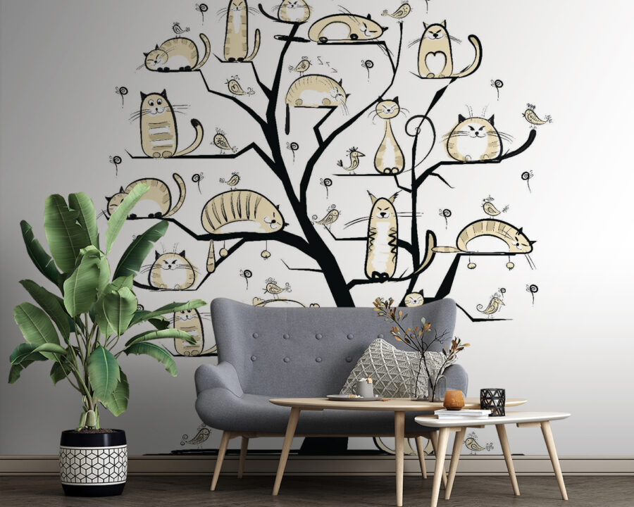 Képzelj el egy szeszélyes fát, amelynek ágait mindenféle formájú és méretű macskák díszítik – egyesek szundikálnak, mások pedig nagy kalandokat terveznek. Ez a falfestmény nem csupán faldekoráció, hanem egy szokatlan beszélgetésindító is. Képzeld el egy hangulatos sarokban, ahol a barátok összegyűlnek, és nevetés tölti be a levegőt. A lágy, semleges tónusok nyugodt hangulatot teremtenek, tökéletesek azokhoz a lusta vasárnapokhoz, amikor csak kávét akarsz kortyolgatni és élvezni a helyiség varázsát. Olyan, mintha egy macska család lenne a falán, mindig készen állva a szórakozásra – vagy a szundikálásra. Macskabarátok? Ők biztosan odalesznek érte.
