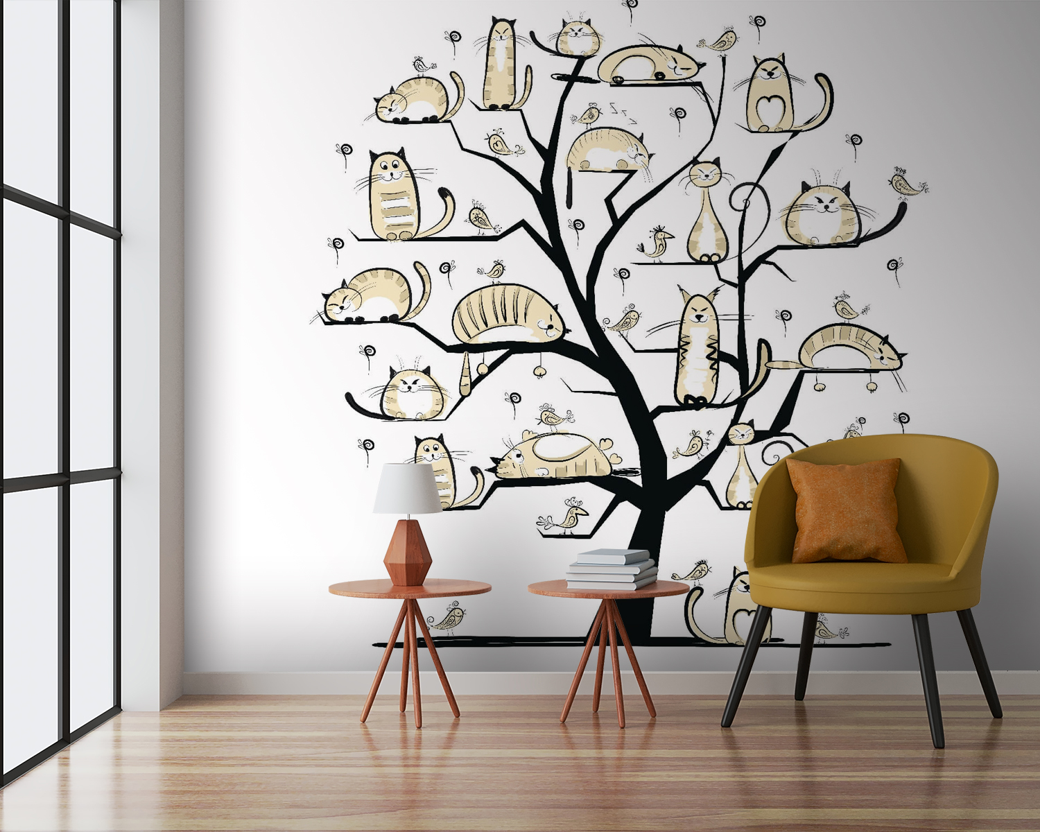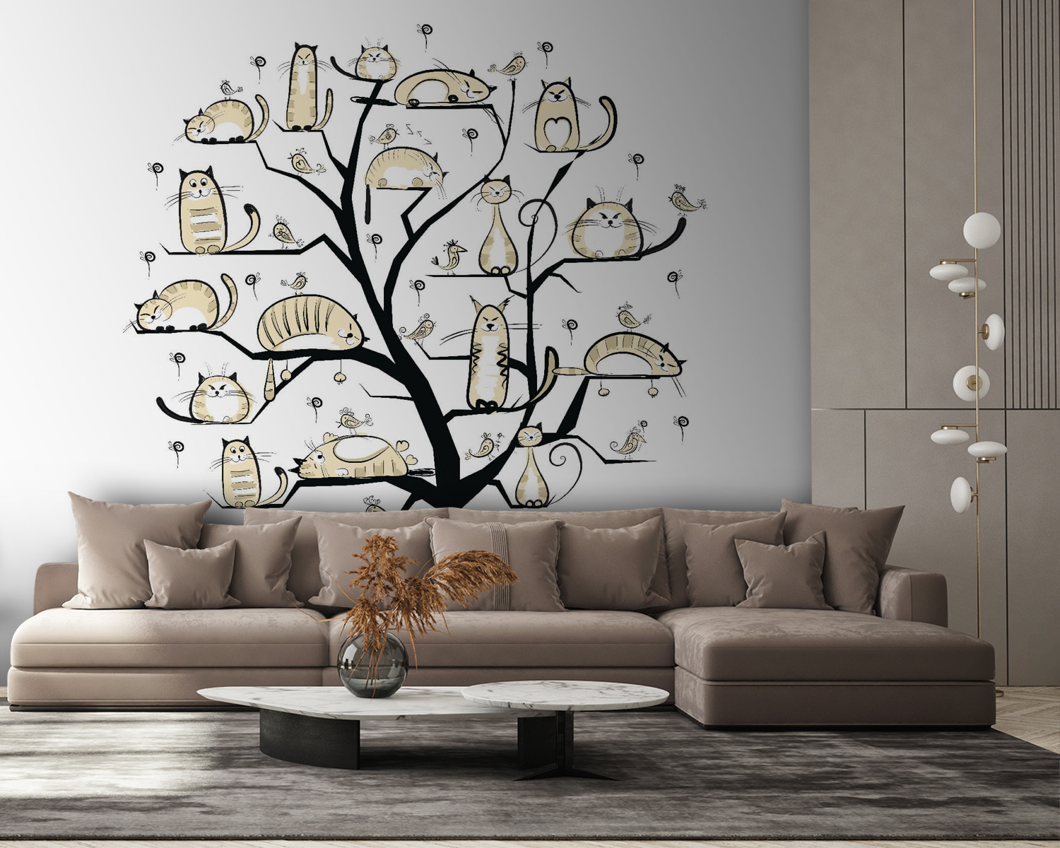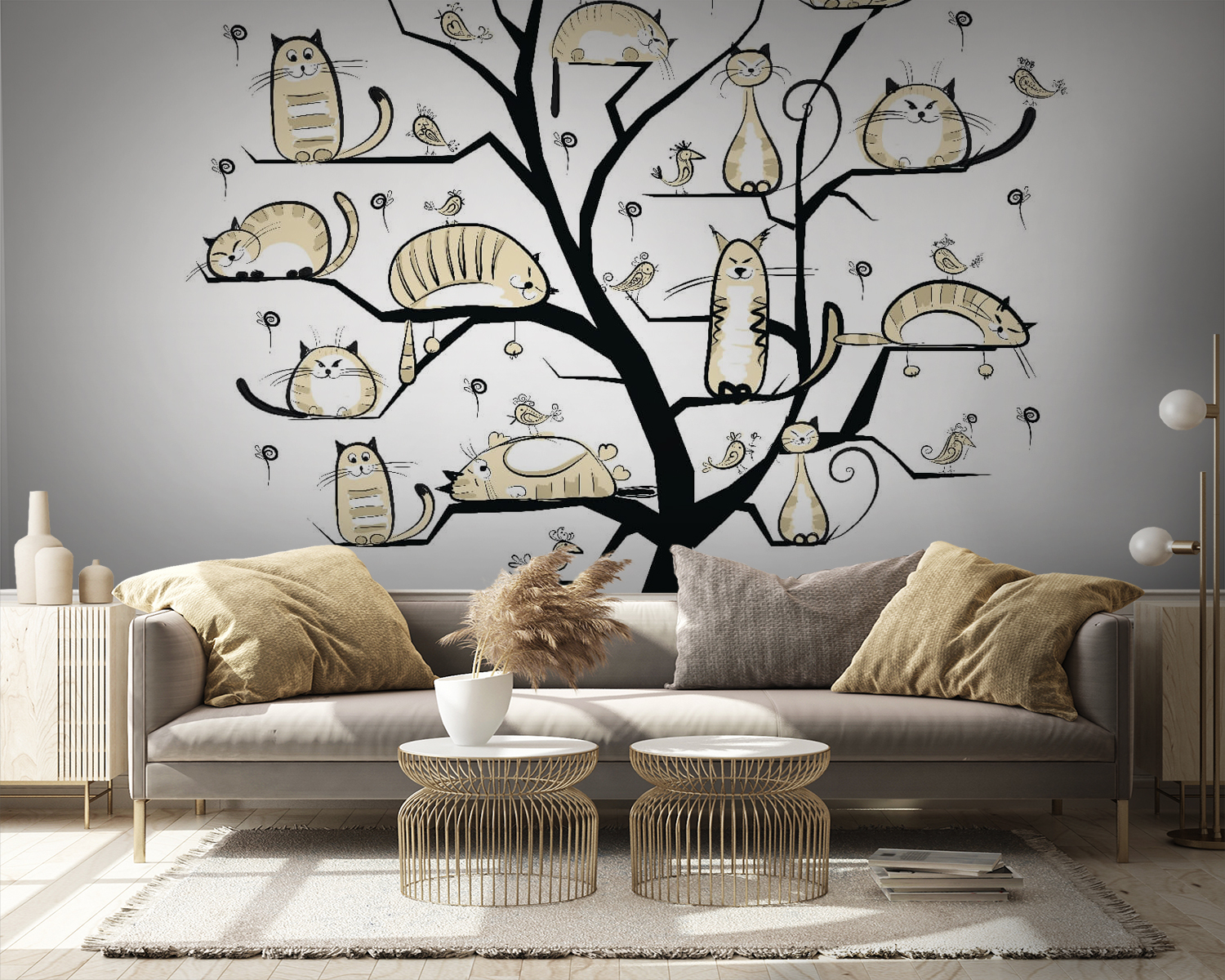 Képzelj el egy szeszélyes fát, amelynek ágait mindenféle formájú és méretű macskák díszítik – egyesek szundikálnak, mások pedig nagy kalandokat terveznek. Ez a falfestmény nem csupán faldekoráció, hanem egy szokatlan beszélgetésindító is. Képzeld el egy hangulatos sarokban, ahol a barátok összegyűlnek, és nevetés tölti be a levegőt. A lágy, semleges tónusok nyugodt hangulatot teremtenek, tökéletesek azokhoz a lusta vasárnapokhoz, amikor csak kávét akarsz kortyolgatni és élvezni a helyiség varázsát. Olyan, mintha egy macska család lenne a falán, mindig készen állva a szórakozásra – vagy a szundikálásra. Macskabarátok? Ők biztosan odalesznek érte.